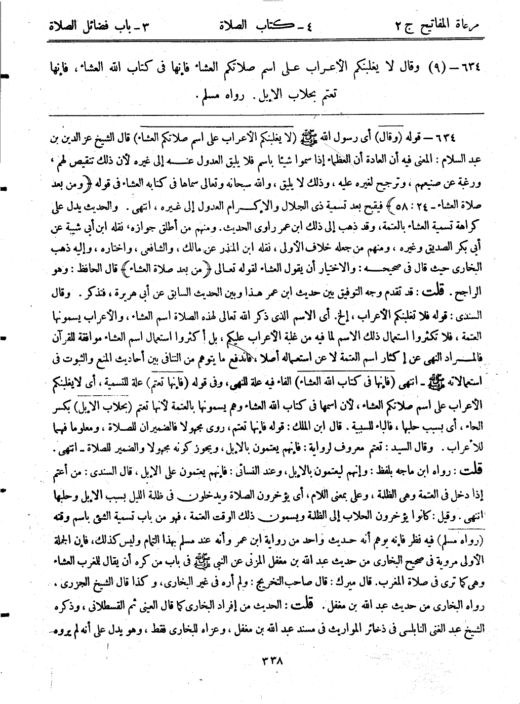 634- (9) وقال: ((لا يغلبنكم الأعراب على اسم صلاتكم العشاء فإنها في كتاب الله العشاء، فإنها