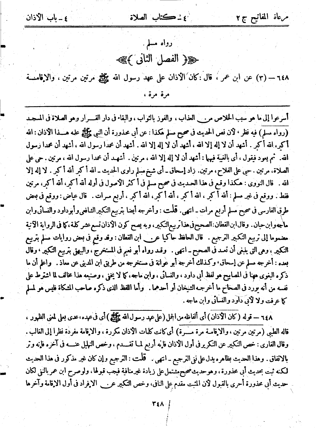 648- (3) عن ابن عمر، قال: ((كان الأذان على عهد رسول الله - صلى الله عليه وسلم - مرتين مرتين، والإقامة مرة