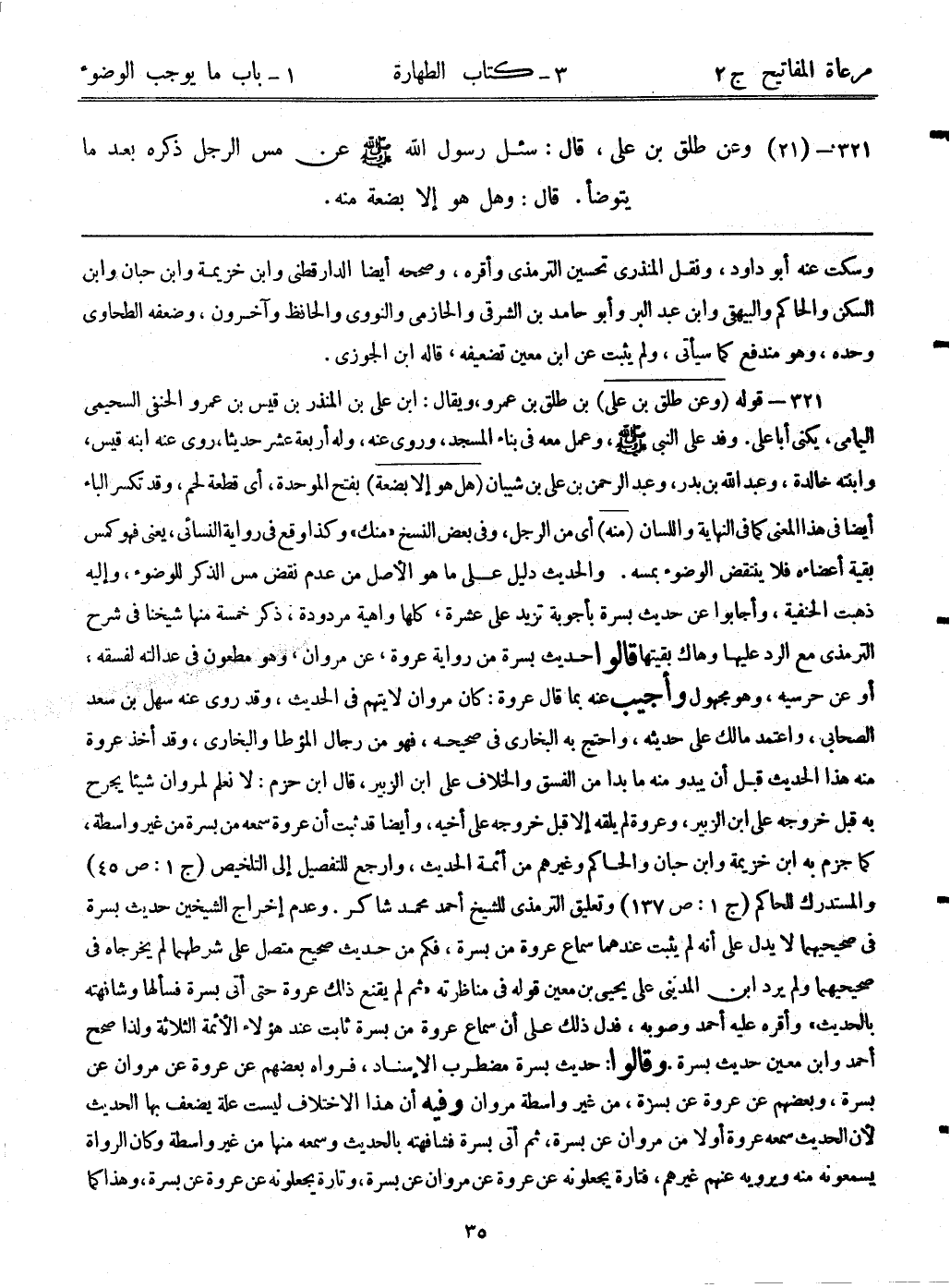 321- (21) وعن طلق بن علي، قال: ((سئل رسول الله - صلى الله عليه وسلم - عن مس الرجل ذكره بعد ما يتوضأ. قال: وهل هو إلا بضعة منه.
