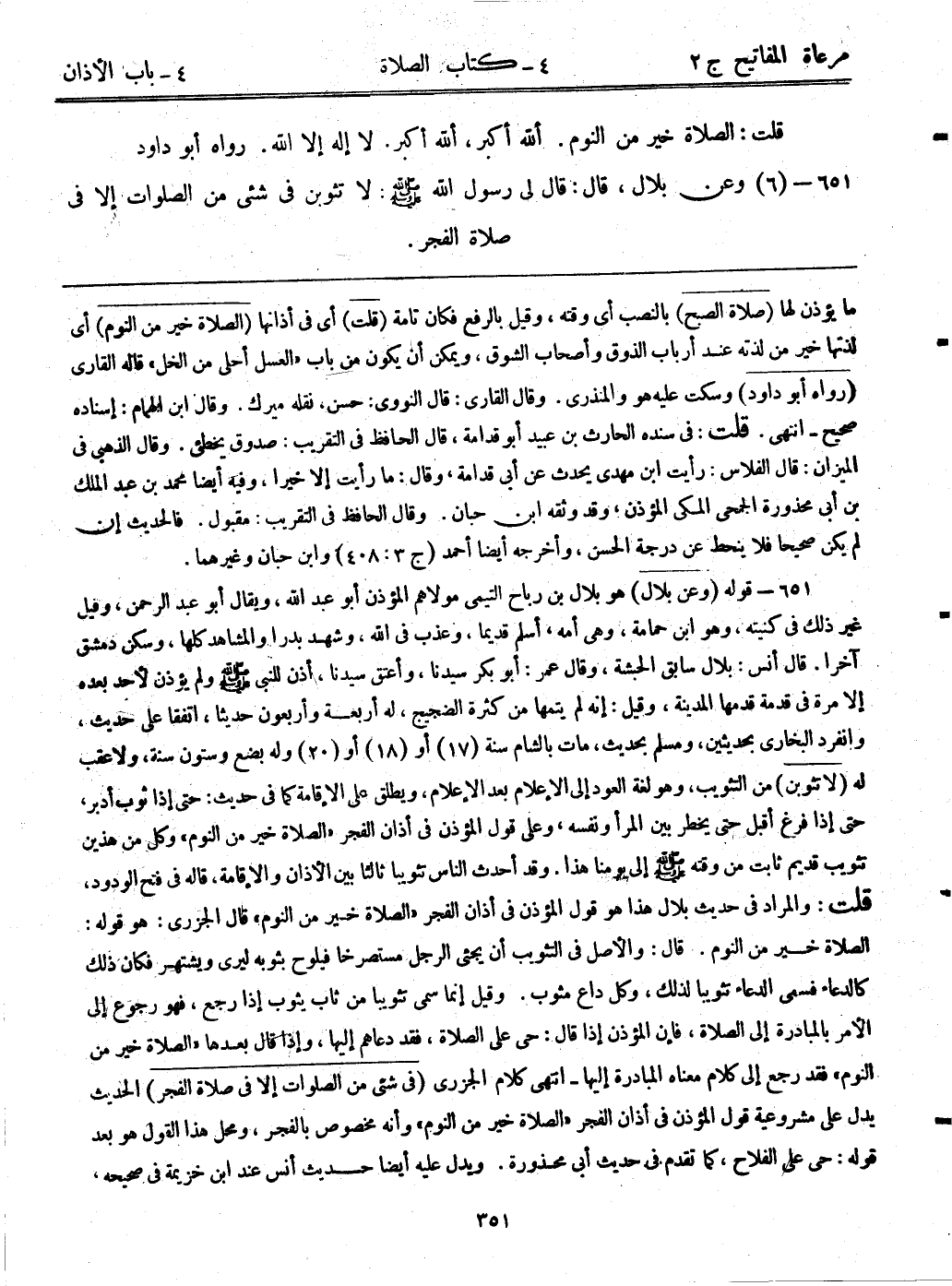 651- قوله: (وعن بلال) هو بل بن رباح التيمي مولاهم المؤذن أبوعبد الله، ويقال أبوعبد الرحمن، وقيل غير ذلك في كنيته، وهو ابن حمامة، وهي أمه، أسلم قديماً. وعذب في الله، وشهد بدراً والمشاهد كلها، وسكن دمشق آخراً. قال أنس: بلال سابق الحبشة، وقال عمر: أبوبكر سيدنا، وأعتق سيدنا، أذن للنبي - صلى الله عليه وسلم - ولم يؤذن لأحد بعده إلا مرة في قدمة قدمها المدينة، وقيل: إنه لم يتمها من كثرة الضجيج، له أربعة وأربعون حديثاً، اتفق على حديث، وانفرد البخاري بحديثين، ومسلم بحديث، مات بالشام سنة (17) أو (18) أو (20) وله بضع وستون سنة، ولا عقب له. (لا تثوبن) من التثويب، وهو لغة العود إلى الإعلام بعد الإعلام، ويطلق على الإقامة كما في حديث: حتى إذا ثوب أدبر، حتى إذا فرغ أقبل حتى يخطر بين المرء ونفسه، وعلى قول المؤذن في أذان الفجر "الصلاة خير من النوم". وكل من هذين تثويب قديم ثابت من وقته - صلى الله عليه وسلم - إلى يومنا هذا. وقد أحدث الناس تثويباً ثالثاً بين الأذان والإقامة، قاله في فتح الودود، قلت: والمراد في حديث بلال هذا هو قول المؤذن في أذان الفجر "الصلاة خير من النوم"، قال الجزري: هو قوله: الصلاة خير من النوم. قال: والأصل في التثويب أن يجيء الرجل مستصرخاً فيلوح بثوبه ليرى ويشتهر فكان ذلك كالدعاء فسمى الدعاء تثويباً لذلك، وكل داع مثوب. وقيل: إنما سمى تثويباً من ثاب يثوب إذا رجع، فهو رجوع إلى الأمر بالمبادرة إلى الصلاة، فإن المؤذن إذا قال: حي على الصلاة، فقد دعاهم إليها، وإذا قال بعدها "الصلاة خير من النوم" فقد رجع إلى كلام معناه المبادرة إليها-انتهى كلام الجزري. (في شيء من الصلوات إلا في صلاة الفجر) الحديث يدل على مشروعية قول المؤذن في أذان الفجر "الصلاة خير من النوم"، وأنه مخصوص بالفجر، ومحل هذا القول هو بعد قوله: حي على الفلاح، كما تقدم في حديث أبي محذورة. ويدل عليه أيضاً حديث أنس عند ابن خزيمة في صحيحه.