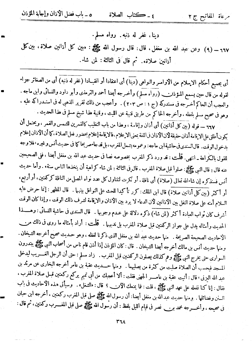 667- (9) وعن عبد الله بن مغفل، قال: قال رسول الله - صلى الله عليه وسلم -: ((بين كل أذانين صلاة، بين كل أذانين