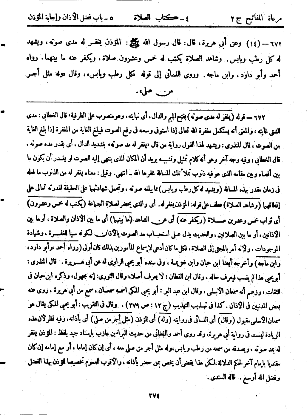 672- قوله: (يغفر له مدى صوته) بفتح الميم والدال، أي نهايته، وهو منصوب على الظرفية، قال الخطابي: مدى الشيء غايته، والمعنى أنه يستكمل مغفرة الله تعالى إذا استوفى وسعه في رفع الصوت فيبلغ الغاية من المغفرة إذا بلغ الغاية من الصوت، قال المنذري: ويشهد لهذا القول رواية من قال "يغفر له مد صوته" بتشديد الدال، أي بقدر مده صوته. قال الخطابي: وفيه وجه آخر وهو أنه كلام تمثيل وتشبيه، يريد أن المكان الذي ينتهي إليه الصوت لو يقدر أن يكون ما بين أقصاه وبين مقامه الذي هو فيه ذنوب تملأ تلك المسافة غفرها الله-انتهى. وقيل: معناه يغفر له من الذنوب ما فعله في زمان مقدر بهذه المسافة. (ويشهد له كل رطب ويابس) مما يبلغه صوته. وتحمل شهادتهما على الحقيقة لقدرته تعالى على إنطاقهما. (وشاهد الصلاة) عطف على قوله: المؤذن يغفر له. أي والذي يحضر لصلاة الجماعة. (يكتب له خمس وعشرون) أي ثواب خمس وعشرين صلاة. (ويكفر عنه) أي عن الشاهد. (ما بينهما) أي ما بين الأذان والصلاة، أو ما بين الأذانين، أو ما بين الصلاتين، والحديث يدل على استحباب مد الصوت بالأذان لكونه سبباً للمغفرة، وشهادة الموجودات، ولأنه أمر المجئ إلى الصلاة، فكل ما كان أدعى لإسماع المأمورين بذلك كان أولى. (رواه أحمد، وأبوداود، وابن ماجه) وأخرجه أيضاً ابن حبان وابن خزيمة، وفي سنده أبويحيى الراوي له عن أبي هريرة. قال المنذري: أبويحيى هذا لم ينسب فيعرف حاله، وقال ابن القطان: لا يعرف أصلاً، وقال الثوري: إنه مجهول، وذكره ابن حبان في الثقات، وزعم أنه سمعان الأسلمي، وقال ابن عبد البر: أبويحيى المكي اسمه سمعان، سمع من أبي هريرة، روى عنه بعض المدنيين في الأذان. كذا في تهذيب التهذيب (ج12: ص279) وقال في التقريب: أبويحيى المكي يقال هو سمعان الأسلمي مقبول. (وقال) أي النسائي في روايته. (وله) أي للمؤذن. (مثل أجر من صلى) أي بأذانه، وفيه نظر؛ لأن هذه الزيادة ليست في رواية أبي هريرة، وقد روى أحمد والنسائي من حديث البراء بن عازب بإسناد جيد بلفظ: المؤذن يغفر له بمد صوته، ويصدقه من سمعه من رطب ويابس، وله مثل أجر من صلى معه، أي إن كان إماماً، أومع إمامه إن كان مقتدياً بإمام آخر لحكم الدلالة، لكن هذا يقضي أن يخص بمن حضر بأذانه، والأقرب العموم تخصيصاً للمؤذن بهذا الفضل وفضل الله أوسع. قاله السندي.