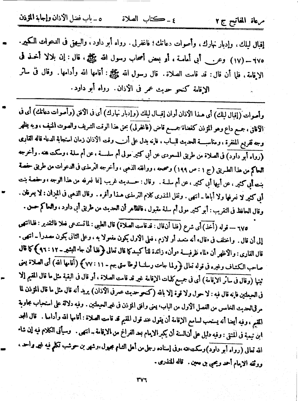 675- (17) وعن أبي أمامة، أو بعض أصحاب رسول الله - صلى الله عليه وسلم -، قال: (إن بلالاً أخذ في الإقامة، فلما أن قال: قد قامت الصلاة. قال رسول الله - صلى الله عليه وسلم -: أقامها الله وأدامها. وقال في سائر الإقامة كنحو حديث عمر في الأذان)) رواه أبوداود.