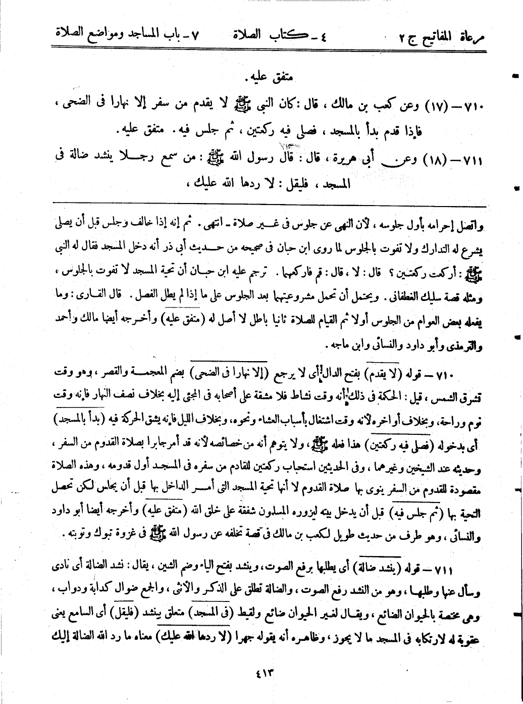 710- (17) وعن كعب بن مالك، قال: ((كان النبي - صلى الله عليه وسلم - لا يقدم من سفر إلا نهاراً في الضحى، فإذا قدم بدأ بالمسجد، فصلى فيه ركعتين، ثم جلس فيه)) متفق عليه.
