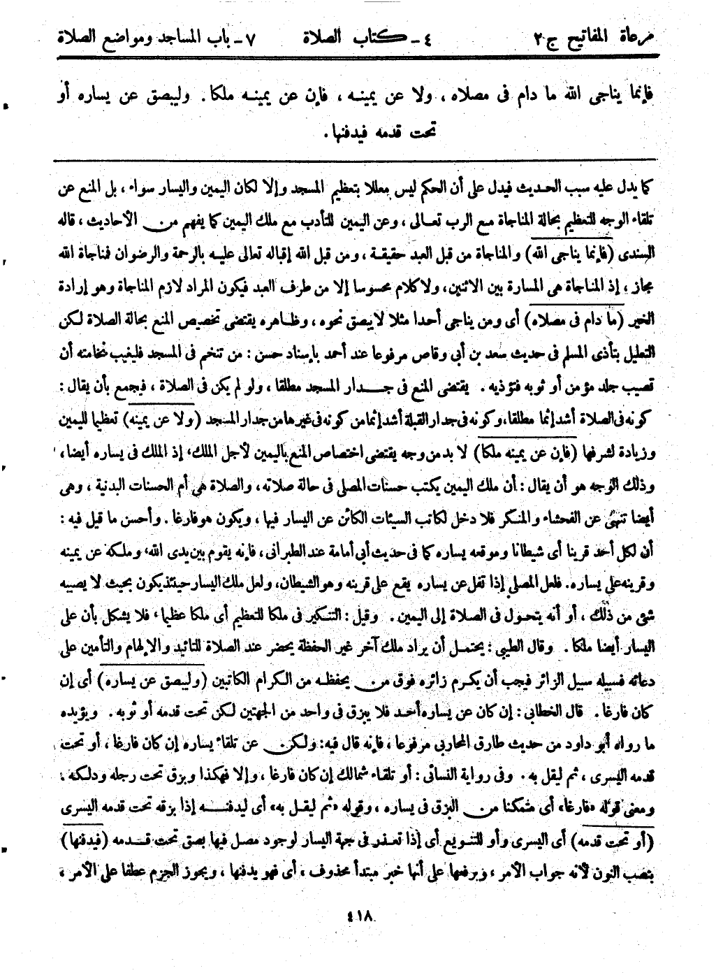 كما يدل عليه سبب الحديث فيدل على أن الحكم ليس معللاً بتعظيم المسجد وإلا لكان اليمين واليسار سواء، بل المنع عن تلقاء الوجه للتعظيم بحالة المناجاة مع الرب تعالى، وعن اليمين للتأدب مع ملك اليمين كما يفهم من الأحاديث، قاله السندي. (فإنما يناجي الله) والمناجاة من قبل العبد حقيقة، ومن قبل الله إقباله تعالى عليه بالرحمة والرضوان فمناجاة الله مجاز، إذ المناجاة هي المسارة بين الاثنين، ولا كلام محسوساً إلا من طرف العبد فيكون المراد لازم المناجاة وهو إرادة الخير. (مادام في مصلاه) أي ومن يناجي أحداً مثلاً لا يبصق نحوه، وظاهره يقتضي تخصيص المنع بحالة الصلاة لكن التعليل بتأذي المسلم في حديث سعد بن أبي وقاص مرفوعاً عند أحمد بإسناد حسن: من تنخم في المسجد فليغيب نخامته أن تصيب جلد مؤمن أو ثوبه فتؤذيه، يقتضي المنع في جدار المسجد مطلقاً، ولو لم يكن في الصلاة، فيجمع بأن يقال: كونه في الصلاة أشد إثماً مطلقاً، وكونه في جدار القبلة أشد إثماً من كونه في غيرها من جدار المسجد. (ولا عن يمينه) تعظيماً لليمين وزيادة لشرفها. (فإن عن يمينه ملكاً) لا بد من وجه يقتضي اختصاص المنع باليمين لأجل الملك، إذا الملك في يساره أيضاً، وذلك الوجه هو أن يقال: أن ملك اليمين يكتب حسنات المصلى في حالة صلاته، والصلاة هي أم الحسنات البدنية، وهي أيضاً تنهى عن الفحشاء والمنكر، فلا دخل لكاتب السيأت الكائن عن اليسار فيها، ويكون هو فارغاً. وأحسن ما قيل فيه: أن لكل أحد قريناً أي شيطاناً، وموقعه يساره كما في حديث أبي أمامة عند الطبراني، فإنه يقوم بين يدي الله، وملكه عن يمينه وقرينه على يساره، فلعل المصلي إذا تفل عن يساره يقع على قرينه وهو الشيطان، ولعل ملك اليسار حينئذٍ يكون بحيث لا يصيبه شيء من ذلك، أو أنه يتحول في الصلاة إلى اليمين. وقيل: التنكير في ملكاً للتعظيم أي ملكاً عظيماً، فلا يشكل بأن على اليسار أيضاً ملكاً. وقال الطيبي: يحتمل أن يراد ملك آخر غير الحفظة يحضر عند الصلاة للتائيد والإلهام والتأمين على دعائه، فسبيله سبيل الزائر فيجب أن يكرم زائره فوق من يحفظه من الكرام الكاتبين. (وليبصق عن يساره) أي إن كان فارغاً. قال الخطابي: إن كان عن يساره أحد فلا يبزق في واحد من الجهتين لكن تحت قدمه أو ثوبه. ويؤيده ما رواه أبوداود من حديث طارق المحاربي مرفوعاً، فإنه قال فيه: ولكن عن تلقاء يساره إن كان فارغاً، أو تحت قدمه اليسرى، ثم ليقل به. وفي رواية النسائي: أو تلقاء شمالك إن كان فارغاً، وإلا فهكذا وبزق تحت رجله ودلكه، ومعنى قوله "فارغاً" أي متمكناً من البزق في يساره، وقوله "ثم ليقل به" أي ليدفنه إذا بزقه تحت قدمه اليسرى. (أو تحت قدمه) أي اليسرى وأو للتنويع أي إذا تعذر في جهة اليسار لوجود مصل فيها بصق تحت قدمه. (فيدفنها) بنصب النون؛ لأنه جواب الأمر، وبرفعها على أنها خبر مبتدأ محذوف، أي فهو يدفنها، ويجوز الجزم عطفاً على الأمر،
