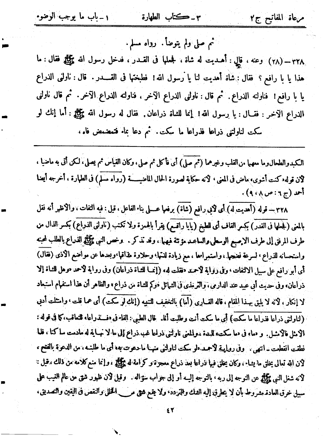 328- قوله: (أهديت له) أي لأبي رافع. (شاة) برفعها على الفاعل، قيل: فيه التفات، والأظهر أنه نقل بالمعنى. (فجعلها في القدر) بكسر القاف أي للطبخ. (يا أبا رافع) يقرأ بالهمزة ولا تكتب. (ناولني الذراع) بكسر الذال من طرف المرفق إلى طرف الإصبع الوسطى والساعد مؤنثة فيهما، وقد تذكر. وخص النبي - صلى الله عليه وسلم - الذراع بالطلب لمحبته واستحسانه للذراع، لسرعة نضجها، واستمرائها، مع زيادة لذتها، وحلاوة مذاقها، وبعدها عن مواضع الأذى. (فقال) أي أبورافع على سبيل الإلتفات، وفي رواية لأحمد "فقلت له". (إنما للشاة ذراعان) وفي رواية لأحمد "وهل للشاة إلا ذراعان"، وفي حديث أبي عبيد عند الدرامي، والترمذي في الشمائل "وكم للشاة ذراع"، والظاهر أن هذا استفهام استبعاد لا إنكار؛ لأنه لا يليق بهذا المقام، قاله القاري. (أما) بالتخفيف للتنبيه. (إنك لو سكت) أي عما قلت، وامتثلت أدبي. (لناولتني ذراعاً فذراعاً ما سكت) أي ما سكت أنت وطلبت أنا. قال الطيبي: الفاء في "فذراعاً للتعاقب، كما في قوله: الأمثل فالأمثل. و"ما" في "ما سكت" للمدة، والمعنى ناولتني ذراعاً غب ذراع إلى ما لا نهاية له مادمتَ ساكتاً، فلما نطقت انقطعت-انتهى. وفي رواية لأحمد "لو سكت لناولتني منها ما دعوت به" أي ما طلبته، من الدعوة بالفتح؛ لأن الله تعالى يخلق ما يشاء، وكان يخلق فيها ذراعاً بعد ذراع معجزة وكرامة له - صلى الله عليه وسلم -، وإنما منع كلامه من ذلك، قيل: لأنه شغل النبي - صلى الله عليه وسلم - عن التوجه إلى ربه، بالتوجه إليه أو إلى جواب سؤاله. وقيل: لأن ظهور شيء من عالم الغيب على سبيل خرق العادة مشروط بأن لا يتطرق إليه الشك والتردد، ولا يقع شيء من الخلل والنقص في اليقين والتصديق،