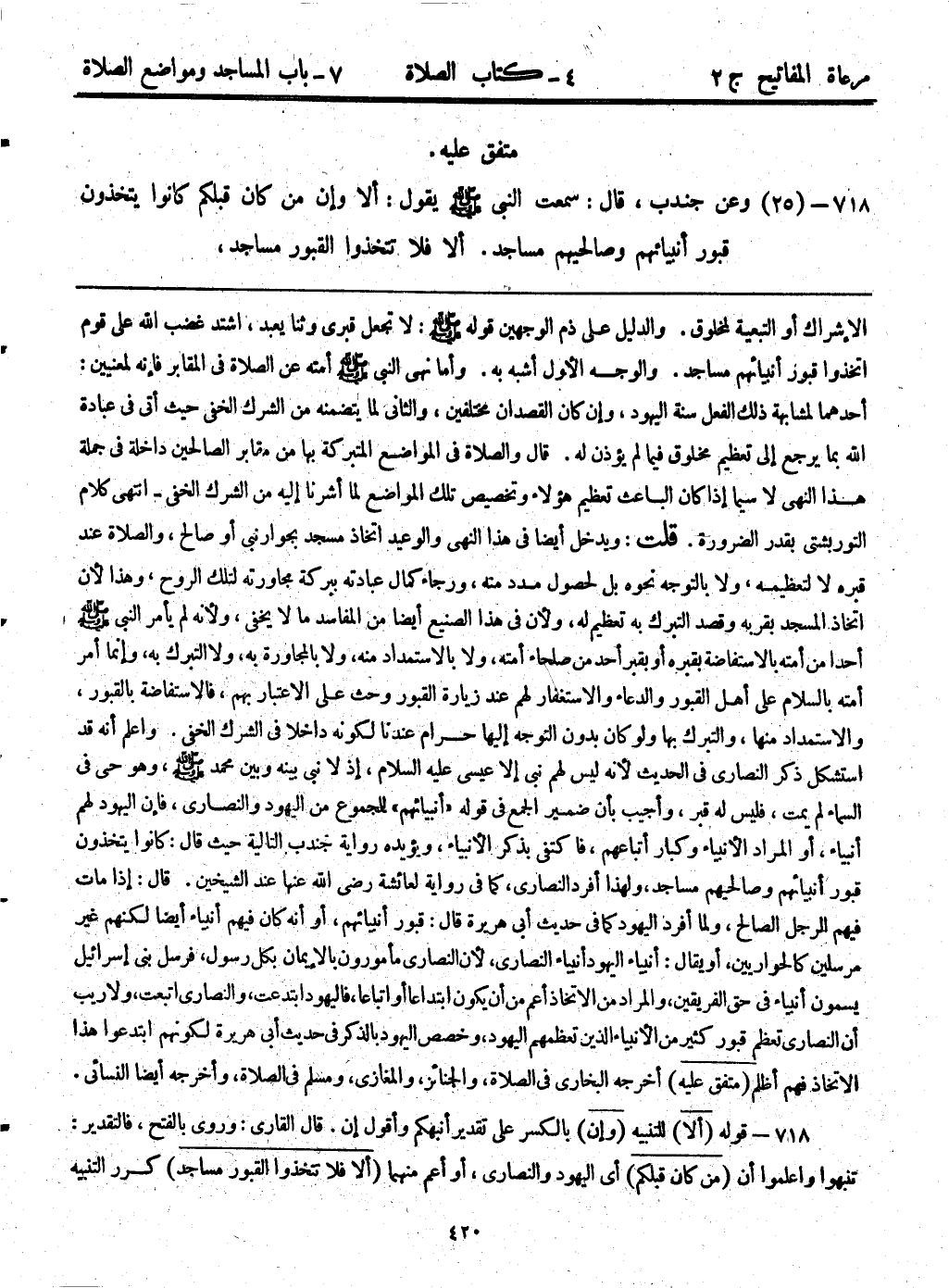 718- (25) وعن جندب، قال: سمعت النبي - صلى الله عليه وسلم - يقول: ((ألا وإن من كان قبلكم كانوا يتخذون قبور أنبيائهم وصالحيهم مساجد. ألا فلا تتخذوا القبور مساجد،