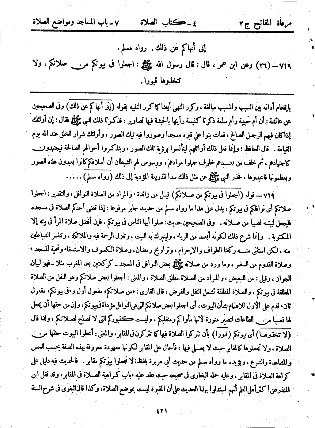 719- قوله: (اجعلوا في بيوتكم من صلاتكم) قيل من زائدة، والمراد من الصلاة النوافل، والتقدير: اجعلوا صلاتكم أي نوافلكم في بيوتكم، يدل على هذا ما رواه مسلم من حديث جابر مرفوعاً: إذا قضى أحدكم الصلاة في مسجده فليجعل لبيته نصيباً من صلاته. وفي الصحيحين حديث: صلوا أيها الناس في بيوتكم، فإن أفضل صلاة المرء في بيته إلا المكتوبة. وإنما شرع ذلك لكونه أبعد من الرياء، وليتبرك به البيت، وتنزل الرحمة فيه والملائكة، وتنفر الشياطين منه، لكن استثنى منه ركعتا الطواف والإحرام، وتراويح رمضان، وصلاة الكسوف والاستسقاء وتحية المسجد، وصلاة القدوم من السفر، وما ورد من صلاته - صلى الله عليه وسلم - بعض النوافل في المسجد- كركعتين بعد المغرب مثلاً – فهو لبيان الجواز، وقيل: من للتبعيض، والمراد من الصلاة مطلق الصلاة، والمعنى: اجعلوا بعض صلاتكم وهو النفل من الصلاة المطلقة في بيوتكم، والصلاة المطلقة تشمل النفل والفرض، قال القاري: "من صلاتكم" مفعول أول و"في بيوتكم" مفعول ثان، قدم على الأول للإهتمام بشأن البيوت، أي اجعلوا بعض صلاتكم التي هي النوافل مؤداة في بيوتكم، وإن من حقها أن يجعل لها نصيباً من الطاعات لتصير منورة؛ لأنها مأواكم ومنقلبكم، وليست كقبوركم التي لا تصلح لصلاتكم، ولذا قال: (لاتتخذوها) أي بيوتكم. (قبوراً) بأن تتركوا الصلاة فيها كما تتركون في المقابر، والمعنى: أعطوا البيوت حظها من الصلاة، ولا تجعلوها كالمقابر حيث لا يصلى فيها، فأحال على المقابر لكونها معهودة معروفة بهذه الصفة بحسب الحس والمشاهدة والشرع، ويؤيده ما رواه مسلم من حديث أبي هريرة بلفظ: لا تجعلوا بيوتكم مقابر. فالحديث فيه دليل على كراهة الصلاة في المقابر، وعليه حمله البخاري في صحيحه حيث عقد عليه "باب كراهية الصلاة في المقابر"، وقد نقل ابن المنذر عن أكثر أهل العلم أنهم استدلوا بهذا الحديث على أن المقبرة ليست بموضع الصلاة، وكذا قال البغوي في شرح السنة