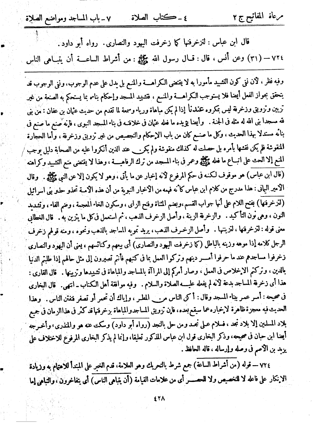 724- (31) وعن أنس قال: قال رسول الله - صلى الله عليه وسلم -: ((من أشراط الساعة أن يتباهي الناس في المساجد)) .