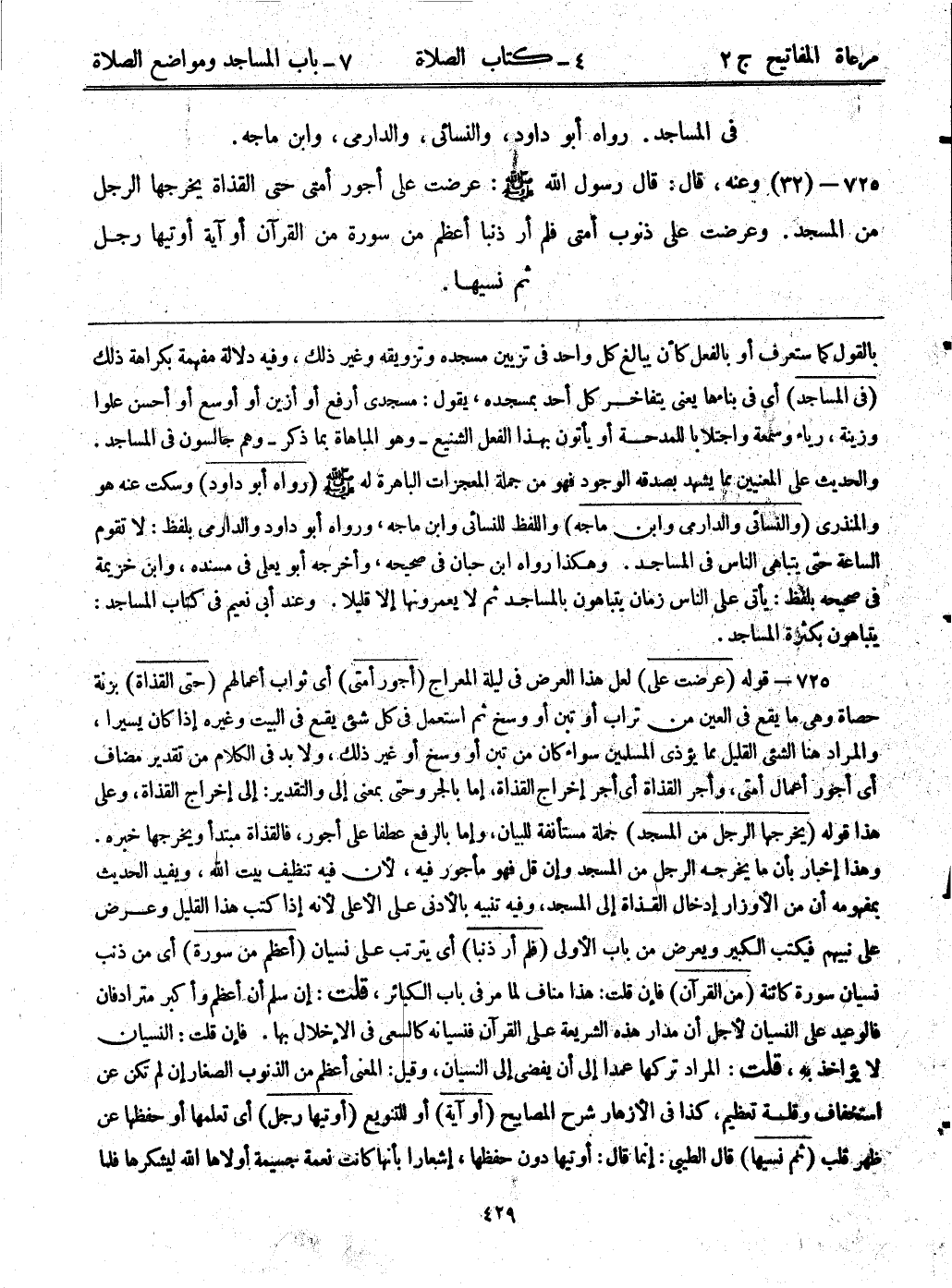 725- قوله: (عرضت عليّ) لعل هذا العرض في ليلة المعراج. (أجور أمتي) أي ثواب أعمالهم. (حتى القذاة) بزنة حصاة وهي ما يقع في العين من تراب أو تبن أو وسخ، ثم استعمل في كل شيء يقع في البيت وغيره إذا كان يسيراً، والمراد هنا الشيء القليل مما يؤذي المسلمين سواء كان من تين أو وسخ أو غير ذلك، ولا بد في الكلام من تقدير مضاف أي أجور أعمال أمتي، وأجر القذاة أي أجر إخراج القذاة، إما بالجر وحتى بمعنى إلى والتقدير: إلى إخراج القذاة، وعلى هذا قوله: (يخرجها الرجل من المسجد) جملة مستأنفة للبيان، وإما بالرفع عطفاً على أجور، فالقذاة مبتدأ ويخرجها خبره. وهذا إخبار بأن ما يخرجه الرجل من المسجد وإن قل فهو مأجور فيه؛ لأن فيه تنظيف بيت الله، ويفيد الحديث بمفهومه أن من الأوزار إدخال القذاة إلى المسجد، وفيه تنبيه بالأدنى على الأعلى؛ لأنه إذا كتب هذا القليل وعرض على نبيهم فيكتب الكبير ويعرض من باب الأولى. (فلم أرَ ذنباً) أي يترتب على نسيان. (أعظم من سورة) أي من ذنب نسيان سورة كائنة. (من القرآن) فإن قلت: هذا مناف لما مر في باب الكبائر، قلت: إن سلم أن أعظم وأكبر مترادفان، فالوعيد على النسيان لأجل أن مدار هذه الشريعة على القرآن، فنسيانه كالسعي في الإخلال بها. فإن قلت: النسيان لا يؤاخذ به، قلت: المراد تركها عمداً إلى أن يفضي إلى النسيان، وقيل: المعنى أعظم من الذنوب الصغار إن لم تكن عن استخفاف وقلة تعظيم، كذا في الأزهار شرح المصابيح. (أو آية) أو للتنويع. (أوتيها رجل) أي تعلمها أو حفظها عن ظهر قلب. (ثم نسيها) قال الطيبي: إنما قال: أوتيها دون حفظها، إشعاراً بأنها كانت نعمة جسيمة أولاها الله ليشكرها، فلما