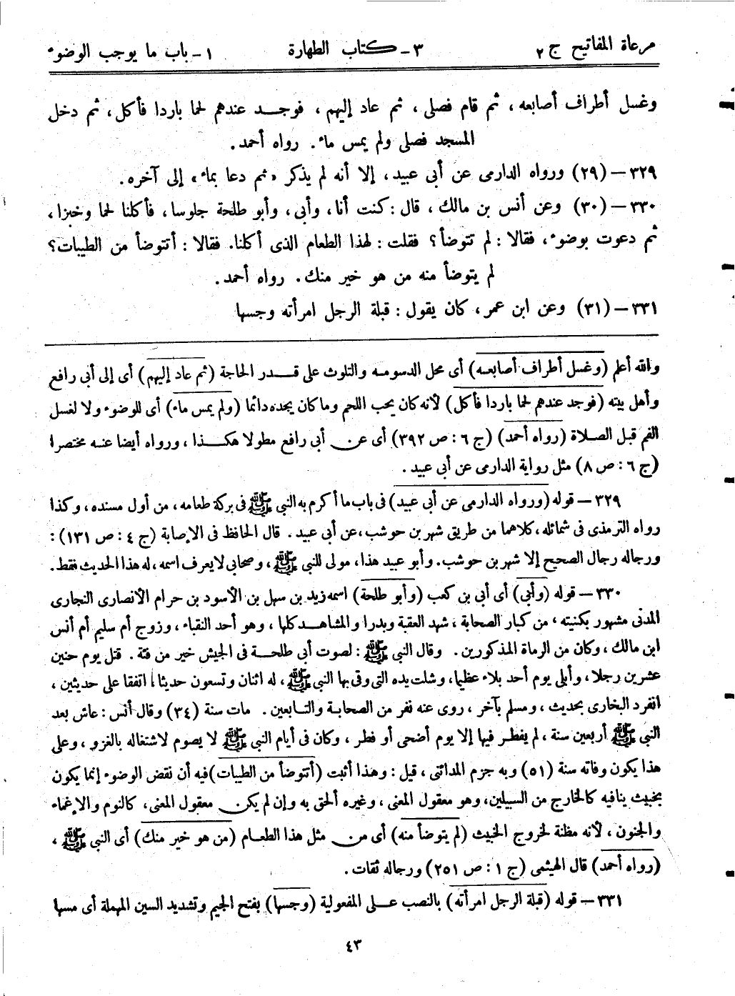 330- (30) وعن أنس بن مالك، قال: (كنت أنا، وأبي، وأبوطلحة جلوساً، فأكلنا لحماً وخبزاً، ثم دعوت بوضوء، فقالا: لم تتوضأ؟ فقلت: لهذا الطعام الذي أكلنا. فقالا: أتتوضأ من الطيبات؟ لم يتوضأ منه من هو خير منك)) رواه أحمد.