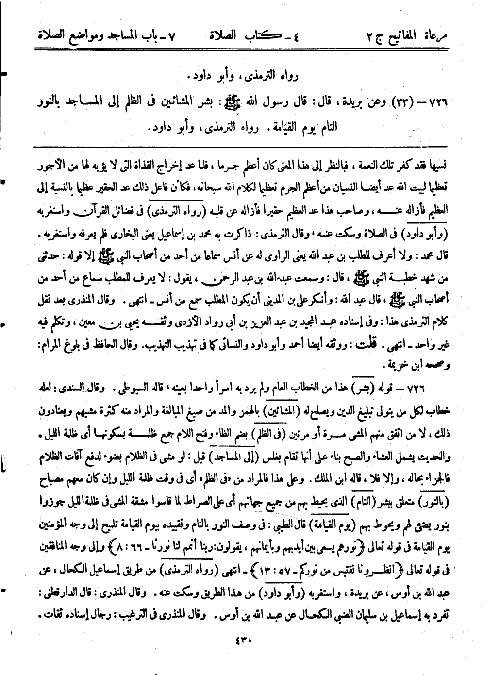726- (33) وعن بريدة، قال: قال رسول الله - صلى الله عليه وسلم -: ((بشر المشائين في الظلم إلى المساجد بالنور التام يوم القيامة)) رواه الترمذي، وأبوداود.