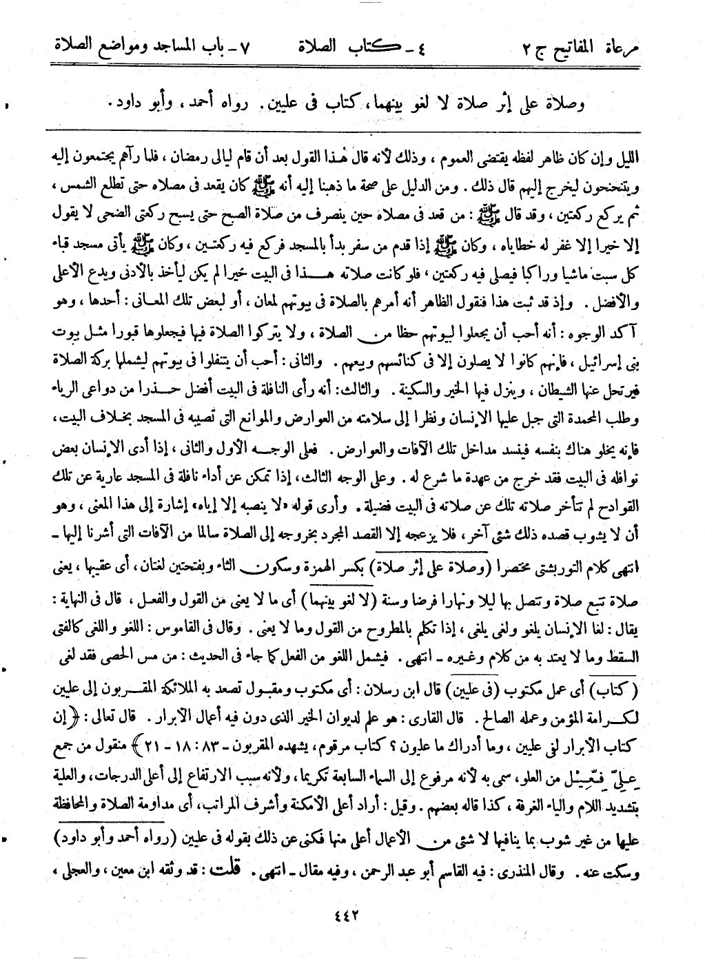 الليل وإن كان ظاهر لفظه يقتضي العموم، وذلك لأنه قال هذا القول بعد أن قام ليالي رمضان، فلما رآهم يجتمعون إليه ويتنحنحون ليخرج إليهم قال ذلك. ومن الدليل على صحة ما ذهبنا إليه أنه - صلى الله عليه وسلم - كان يقعد في مصلاه حتى تطلع الشمس، ثم يركع ركعتين، وقد قال - صلى الله عليه وسلم -: من قعد في مصلاه حين ينصرف من صلاة الصبح حتى يسبح ركعتي الضحى لا يقول إلا خيراً إلا غفر له خطاياه، وكان - صلى الله عليه وسلم - إذا قدم من سفر بدأ بالمسجد فركع فيه ركعتين، وكان - صلى الله عليه وسلم - يأتي مسجد قباء كل سبت ماشياً وراكباً فيصلي فيه ركعتين، فلو كانت صلاته هذا في البيت خيراً لم يكن ليأخذ بالأدنى ويدع الأعلى والأفضل. وإذ قد ثبت هذا فنقول الظاهر أنه أمرهم بالصلاة في بيوتهم لمعان، أو لبعض تلك المعاني: أحدها، وهو آكد الوجوه: أنه أحب أن يجعلوا لبيوتهم حظا من الصلاة، ولا يتركوا الصلاة فيها فيجعلوها قبورا مثل بيوت بني إسرائيل، فإنهم كانوا لا يصلون إلا في كنائسهم وبيعهم. والثاني: أحب أن يتنفلوا في بيوتهم ليشملها بركة الصلاة فيرتحل عنها الشيطان، وينزل فيها الخير والسكنية. والثالث: أنه رأى النافلة في البيت أفضل حذرا من دواعي الرياء وطلب المحمدة التي جبل عليها الإنسان ونظراً إلى سلامته من العوارض والموانع التي تصيبه في المسجد بخلاف البيت، فإنه يخلو هناك بنفسه فينسد مداخل تلك الآفات والعوارض. فعلى الوجه الأول والثاني، إذا أدى الإنسان بعض نوافله في البيت فقد خرج من عهدة ما شرع له. وعلى الوجه الثالث، إذا تمكن عن أداء نافلة في المسجد عارية عن تلك القوادح لم تتأخر صلاته تلك عن صلاته في البيت فضيلة. وأرى قوله "لا ينصبه إلا إياه" إشارة إلى هذا المعنى، وهو أن لا يشوب قصده ذلك شيء آخر، فلا يزعجه إلا القصد المجرد بخروجه إلى الصلاة سالما من الآفات التي أشرنا إليها- انتهى كلام التوربشتي مختصراً (وصلاة على إثر صلاة) بكسر الهمزة وسكون الثاء وبفتحتين لغتان، أي: عقبيهما، يعني صلاة تتبع صلاة وتتصل بها ليلاً ونهاراً فرضاً وسنة (لا لغو بينهما) أي: ما لا يعني من القول والفعل، قال في النهاية: يقال: لغا الإنسان يلغو ولغى يلغى، إذا تكلم بالمطروح من القول وما لا يعني. وقال في القاموس: اللغو واللغى كالفتى السقط وما لا يعتد به من كلام وغيره - انتهى. فيشمل اللغو من الفعل كما جاء في الحديث: من مس الحصى فقد لغى (كتاب) أي: عمل مكتوب (في عليين) قال ابن رسلان: أي: مكتوب ومقبول تصعد به الملائكة المقربون إلى عليين لكرامة المؤمن وعمله الصالح. قال القاري: هو علم لديوان الخير الذي دون فيه أعمال الأبرار. قال تعالى {إن كتاب الأبرار لفي عليين، وما أدراك ما عليون؟ كتاب مرقوم، يشهد المقربون} [21، 18:83) منقول من جمع علي فعيل من العو، سمى به لأنه مرفوع إلى السماء السابعة تكريما، ولأنه سبب الارتفاع إلى أعلى الدرجات، والعليلة بتشديد اللام والياء الغرفة، كذا قاله بعضهم. وقيل: أراد أعلى الأمكنة وأشرف المراتب، أي: مداومة الصلاة والمحافظة عليها من غير شوب بما ينافيها لا شيء من الأعمال أعلى منها فكنى عن ذلك بقوله في عليين (رواه أحمد وأبوداود) وسكت عنه. وقال المنذري: فيه القاسم أبوعبد الرحمن، وفيه مقال-انتهى. قلت: قد وثقه ابن معين، والعجلي،