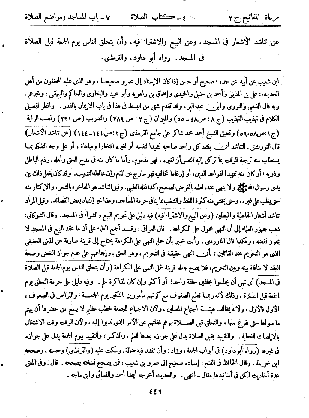 ابن شعيب عن أبيه عن جده، صحيح أو حسن إذا كان الإسناد إلى عمرو صحيحاً، وهو الذي عليه المحققون من أهل الحديث: علي بن المديني وأحمد بن حنبل والحميدي وإسحاق بن راهويه وأبوعبيد والبخاري والحاكم والبيهقي، وغيرهم. وبه قال الذهبي والنووي وابن عبد البر، وقد تقدم شيء من البسط في هذا في باب الإيمان بالقدر. وانظر تفصيل الكلام في تهذيب التهذيب (ج8:ص48-55) والميزان (ج2:ص289) والتدريب (ص221) ونصب الراية (ج1:ص59، 58) وتعليق الشيخ أحمد محمد شاكر على جامع الترمذي (ج2:ص141-144) (عن تناشد الأشعار) قال التوربشتي: التناشد أن ينشد كل واحد صاحبه نشيداً لنفسه أو لغيره افتخاراً ومباهاة، أو على وجه التفكه بما يستطاب منه ترجية للوقت بما تركن إليه النفس أو لغيره، فهو مذموم، وأما ما كان منه في مدح الحق وأهله، وذم الباطل وذويه، أو كان منه تمهيدا لقواعد الدين، أو إرغاماً لمخالفيه فهو خارج عن الذم وإن خالطه التشبيب. وقد كان يفعل ذلك بين يدى رسول الله - صلى الله عليه وسلم - ولا ينهى عنه، لعلمه بالغرض الصحيح، كذا نقله الطيبي. وقيل التناشد هو المفاخر بالشعر، والإكثار منه حتى يغلب على غيره، وحتى يخشى منه كثرة اللغط والشغب مما ينافي حرمة المساجد، وهذا غير إنشاد بعض القصائد. وقيل المراد تناشد أشعار الجاهلية والمبطلين (وعن البيع والاشتراء فيه) فيه دليل على تحريم البيع والشراء في المسجد. وقال الشوكاني: ذهب جمهور العلماء إلى أن النهي محمول على الكراهة. قال العراقي: وقد أجمع العلماء على أن ما عقد البيع في المسجد لا يجوز نقضه، وهكذا قال الماوردي. وأنت خبير بأن حمل النهي على الكراهة يحتاج إلى قرينة صارفة عن المعنى الحقيقي الذي هو التحريم عند القائلين: بأن النهي حقيقة في التحريم، وهو الحق، وإجماعهم على عدم جواز النقض وصحة العقد لا منافاة بينه وبين التحريم، فلا يصح جعله قرينة لحمل النهي على الكراهة (وأن يتحلق الناس يوم الجمعة قبل الصلاة في المسجد) أي: نهى أن يجلسوا محلقين حلقة واحدة أو أكثر وإن كان لمذاكرة علم. وفيه دليل على حرمة التحلق يوم الجمعة قبل الصلاة، وذلك لأنه ربما قطع الصفوف مع كونهم مأمورين بالتبكير يوم الجمعة، والتراص في الصفوف، الأول فالأول، ولأنه يخالف هيئة اجتماع المصلين، ولأن الاجتماع للجمعة خطب عظيم لا يسمع من حضرها أن يهتم ما سواها حتى يفرغ منها، والتحلق قبل الصلاة يوهم غفلتهم عن الأمر الذي ندبوا إليه، ولأن الوقت وقت الاشتغال بالإنصات للخطبة. والتقييد بقبل الصلاة يدل على جوازه بعدها للعلم، والذكر، والتقييد بيوم الجمعة يدل على جوازه في غيرها (رواه أبوداود) في أبواب الجمعة، وزاد: وأن تنشد فيه ضالة. وسكت عليه (والترمذي) وحسنه، وصححه ابن خزيمة. وقال الحافظ في الفتح: إسناده صحيح إلى عمرو بن شعيب، فمن يصحح نسخته يصححه. قال: وفي المعنى عدة أحاديث لكن في أسانيدها مقال-انتهى. والحديث أخرجه أيضاً أحمد والنسائي وابن ماجه.