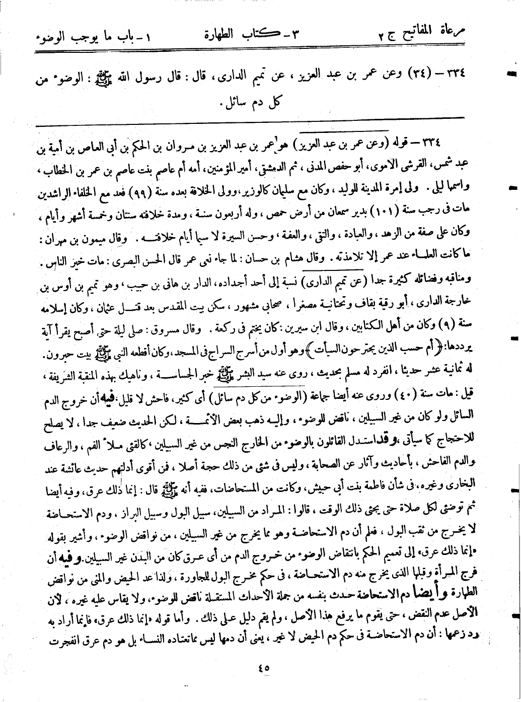 334- (34) وعن عمر بن عبد العزيز، عن تميم الداري، قال: قال رسول الله - صلى الله عليه وسلم -: ((الوضوء من كل دم سائل))