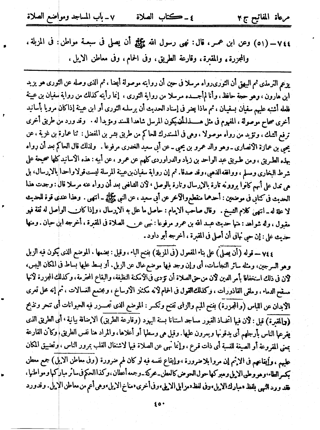 744- (51) وعن ابن عمر، قال: ((نهى رسول الله - صلى الله عليه وسلم - أن يصلي في سبعة مواطن: في المزيلة،
