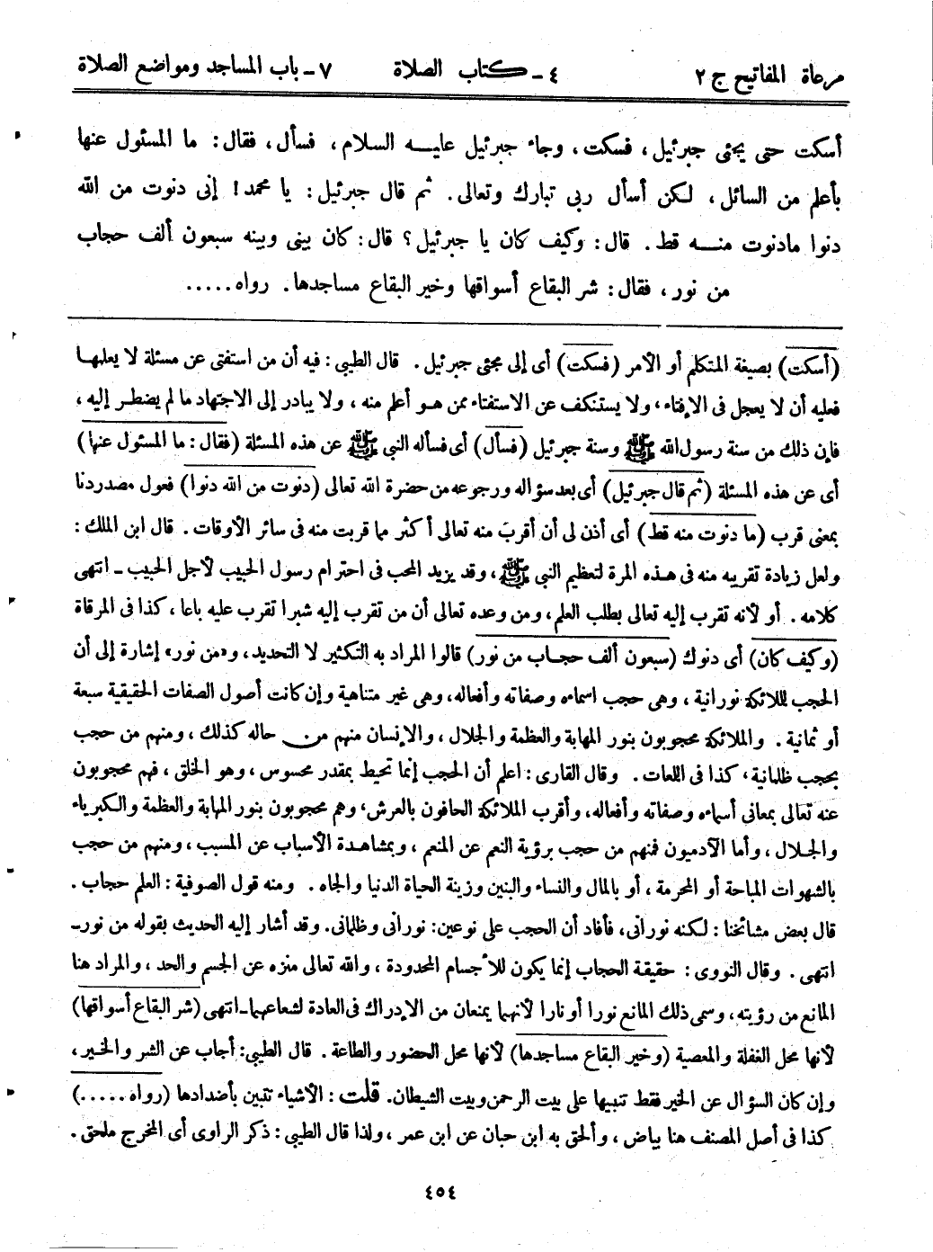أسكت حتى يجيء جبريل، فسكت، وجاء جبرئيل عليه السلام، فسأل، فقال: ما المسئول عنها بأعلم من السائل، لكن أسأل ربي تبارك وتعالى. ثم قال جبريل: يا محمد! إني دنوت من الله دنواً ما دنوت منه قط. قال: وكيف كان يا جبريل؟ قال: كان بيني وبينه سبعون ألف حجاب من نور، فقال: شر البقاع أسواقها وخير القاع مساجدها)) . رواه. . . . . .