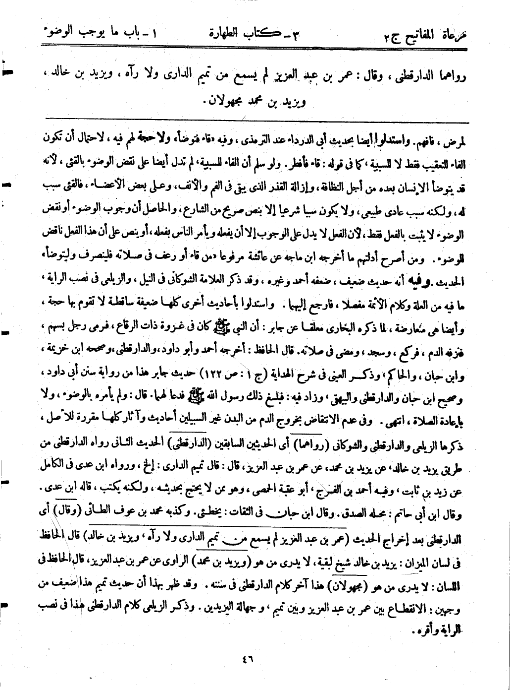 لمرض، فافهم. واستدلوا أيضاً بحديث أبي الدرداء عند الترمذي، وفيه "قا فتوضأ" ولا حجة لهم فيه، لاحتمال أن تكون الفاء للتعقيب فقط لا للسببية، كما في قوله: قاء فأفطر. ولو سلم أن الفاء للسببية، لم تدل أيضاً على نقض الوضوء بالقيء؛ لأنه قد يتوضأ الإنسان بعده من أجل النظافة، وإزالة القذر الذي يبقى في الفم والأنف، وعلى بعض الأعضاء، فالقيء سبب له، ولكنه سبب عادي طبيعي، ولا يكون سبباً شرعياً إلا بنص صريح من الشارع، والحاصل أن وجوب الوضوء أو نقض الوضوء لا يثبت بالفعل فقط؛ لأن الفعل لا يدل على الوجوب إلا أن يفعله ويأمر الناس بفعله، أو ينص على أن هذا الفعل ناقض للوضوء. ومن أصرح أدلتهم ما أخرجه ابن ماجه عن عائشة مرفوعاً "من قاء أو رعف في صلاته فلينصرف وليتوضأ" الحديث. وفيه أنه حديث ضعيف، ضعفه أحمد وغيره، وقد ذكر العلامة الشوكاني في النيل، والزيلعي في نصب الراية، ما فيه من العلة وكلام الأئمة مفصلاً، فارجع إليهما. واستدلوا بأحاديث أخرى كلها ضعيفة ساقطة لا تقوم بها حجة، وأيضاً هي معارضة لما ذكره البخاري معلقاً عن جابر: أن النبي - صلى الله عليه وسلم - كان في غزوة ذات الرقاع، فرمى رجل بسهم، فنزفه الدم، فركع وسجد، ومضى في صلاته. قال الحافظ: أخرجه أحمد وأبوداود، والدارقطني، وصححه ابن خزيمة، وابن حبان، والحاكم، وذكر العيني في شرح الهداية (ج1: ص122) حديث جابر هذا من رواية سنن أبي داود، وصحيح ابن حبان والدارقطني والبيهقي، وزاد فيه: فبلغ ذلك رسول الله - صلى الله عليه وسلم -: فدعا لهما. قال: ولم يأمره بالوضوء، ولا بإعادة الصلاة، انتهى. وفي عدم الانتقاض بخروج الدم من البدن غير السبيلين أحاديث وآثار كلها مقررة للأصل، ذكرها الزيلعي والدارقطني والشوكاني. (رواهما) أي الحديثين السابقين. (الدارقطني) الحديث الثاني رواه الدارقطني من طريق يزيد بن خالد، عن يزيد بن محمد، عن عمر بن عبد العزيز، قال: قال تميم الداري: الخ ورواه ابن عدى في الكامل عن زيد بن ثابت، وفيه أحمد بن الفرج، أبوعتبة الحمصي، وهو ممن لا يحتج بحديثه، ولكنه يكتب، قاله ابن عدى. وقال ابن أبي حاتم: محله الصدق. وقال ابن حبان في الثقات: يخطئ. وكذبه محمد بن عوف الطائي. (وقال) أي الدارقطني بعد إخراج الحديث. (عمر بن عبد العزيز لم يسمع من تميم الداري ولا رآه، ويزيد بن خالد) قال الحافظ في لسان الميزان: يزيد بن خالد شيخ لبقية، لا يدرى من هو. (ويزيد بن محمد) الراوي عن عمر بن عبد العزيز، قال الحافظ في اللسان: لا يدرى من هو. (مجهولان) هذا آخر كلام الدارقطني في سننه. وقد ظهر بهذا أن حديث تميم هذا ضعيف من وجهين: الانقطاع بين عمر بن عبد العزيز وبين تميم، وجهالة اليزيدين. وذكر الزيلعي كلام الدارقطني هذا في نصب الراية وأقره.