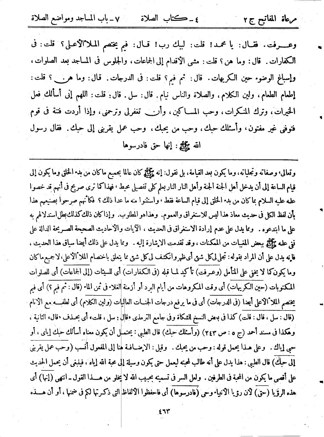 وتعالى، وصفاته وتجلياته، وما يكون بعد القيامة، بل نقول: إنه - صلى الله عليه وسلم - كان عالماً بجميع ما كان من بدء الخلق وما يكون إلى قيام الساعة إلى أن يدخل أهل الجنة الجنة وأهل النار النار بعلم كلي تفصيلي محيط، فهذا كما ترى صريح في أنهم قد خصوا علمه عليه السلام بما كان من بدء الخلق إلى قيام الساعة فقط، واستثنوا منه ماعدا ذلك؟ فكأنهم صرحوا بصنيعهم هذا بأن لفظ الكل في حديث معاذ هذا ليس لاستغراق والعموم. وهذا هو المطلوب. وإذا كان كذلك بطل استدلالهم به على ما ابتدعوه. ومما يدل على عدم إرادة الاستغراق في الحديث، الآيات والأحاديث الصريحة الدالة على نفى علمه - صلى الله عليه وسلم - ببعض المغيبات من الممكنات، وقد تقدمت الإشارة إليه. ومما يدل على ذلك أيضاً سياق هذا الحديث، فإنه يدل على أن المراد بقوله: تجلى لي كل شيء أي: ظهر وانكشف لي كل شيء مما يتعلق باختصام الملأ الأعلى، لا جميع ما كان وما يكون كما لا يخفى على المتأمل (وعرفت) تأكيد لما قبله (في الكفارات) أي: للسيئات (إلى الجماعات) أي: الصلوات المكتوبات (حين الكريهات) أي: وقت المكروهات من أيام البرد أو أزمنة الغلاء في ثمن الماء (قال: ثم فيم؟) أي: فيم يختصم الملأ الأعلى أيضاً (في الدرجات) أي: في ما يرفع الجنات العاليات (ولين الكلام) أي: لطفه مع الأنام (قال: سل، قال: قلت) كذا في بعض النسخ للمشكاة وفي جامع الترمذي "قال: قلت" أي: بحذف"قال" الثانية، وهكذا في مسند أحمد (ج5:ص243) (وأسألك حبك) قال الطيبي: يحتمل أن يكون معناه أسألك حبك إياي، أو حبي إياك. وعلى هذا يحمل قوله: وحب من يحبك. وقيل: الإضافة هنا إلى المفعول أنسب (وحب عمل يقربني إلى حبك) قال الطيبي: هذا يدل على أنه طالب لمحبته ليعمل حتى يكون وسيلة إلى محبة الله إياه، فينبغي أن يحمل الحديث على أقصى ما يكون من المحبة في الطرفين. ولعل السر في تسميته بحبيب الله لا يخلو من هذا القول- انتهى (إنها) أي: هذه الرؤيا (حق) لأن رؤيا الأنبياء وحي (فادرسوها) أي: فاحفظوا الألفاظ التي ذكرتها لكم في ضمنها، أو أن هذه