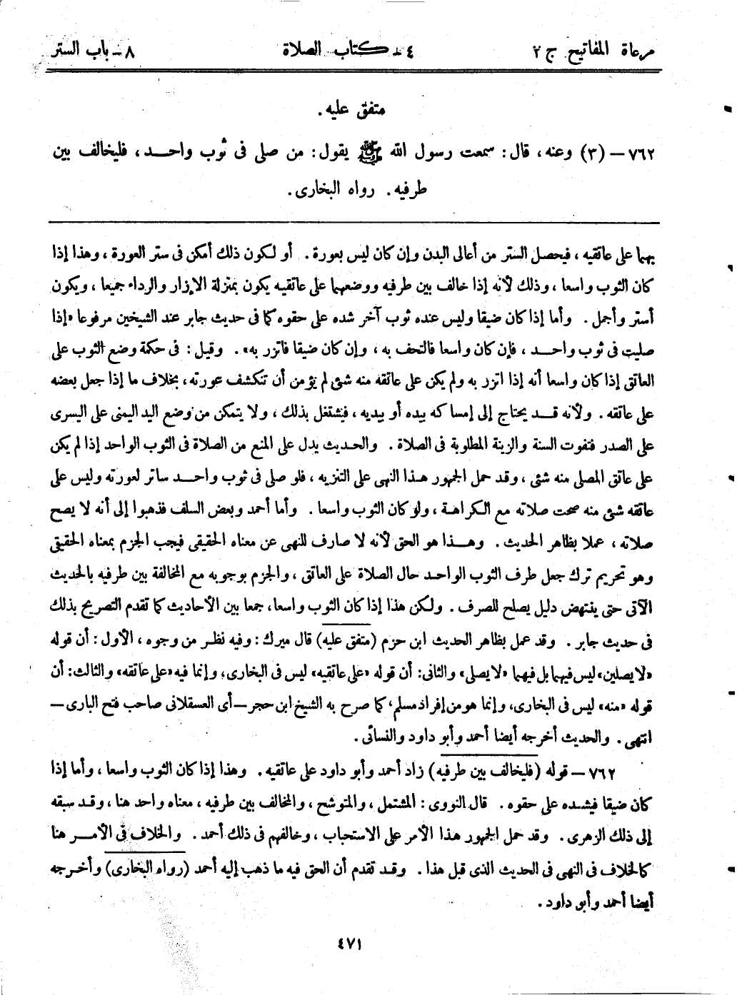 762- (3) وعنه، قال: سمعت رسول الله - صلى الله عليه وسلم - يقول: ((من صلى في ثوب واحد، فليخالف بين طرفيه)) رواه البخاري.