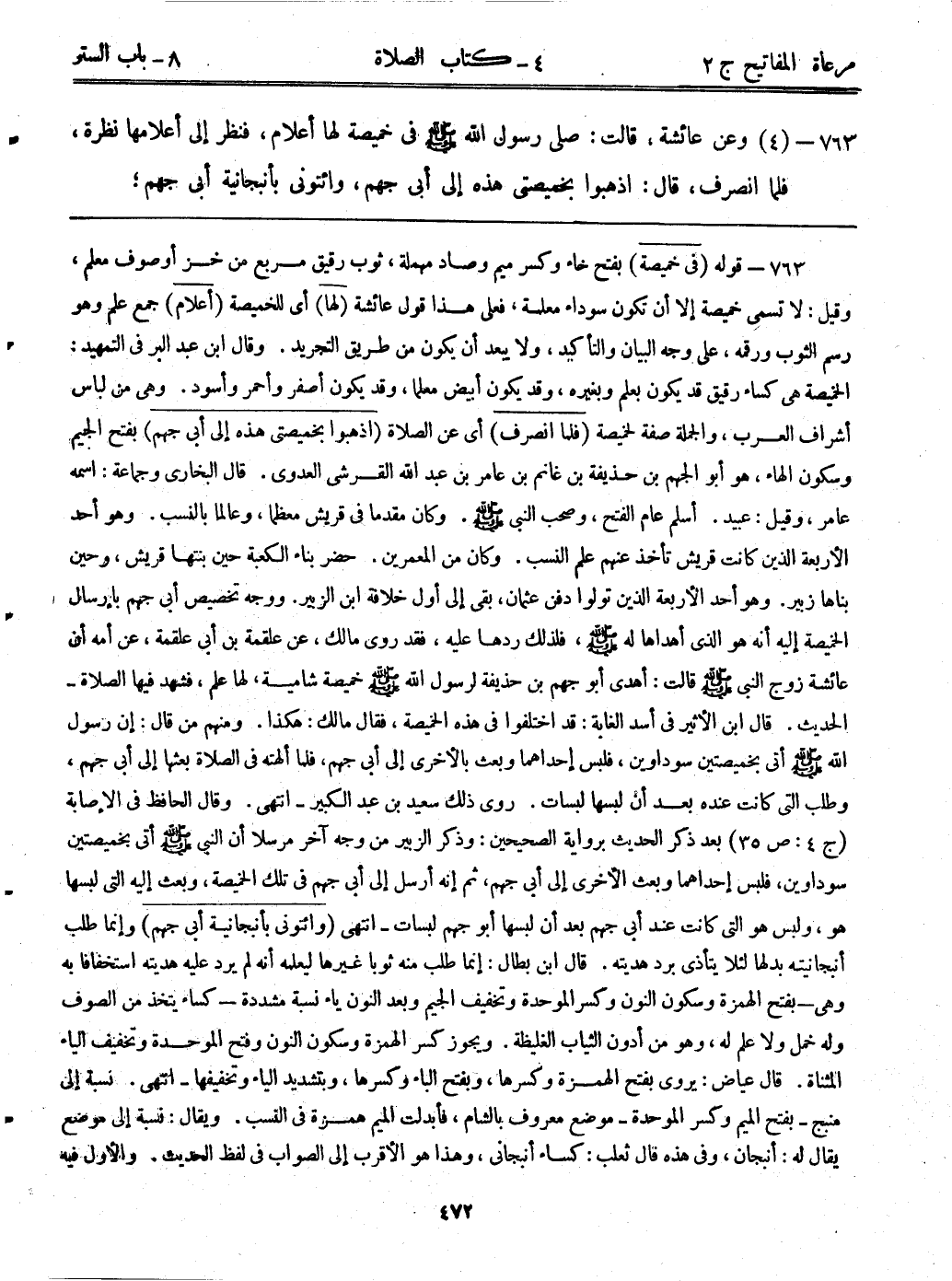 763- قوله: (في خميصة) بفتح خاء وكسر ميم وصاد مهملة، ثوب رقيق مربع من خز أو صوف معلم، وقيل: لا تسمى خميصة إلا أن تكون سوداء معلمة، فعلى هذا قول عائشة (لها) أي: للخميصة (أعلام) جمع علم وهو رسم الثوب ورقمه، على وجه البيان والتأكيد، ولا يبعد أن يكون من طريق التجريد. وقال ابن عبد البر في التمهيد: الخميصة هي كساء رقيق قد يكون بعلم وبغيره، وقد يكون أبيض معلماً، وقد يكون أصفر وأحمر وأسود. وهي من لباس أشراف العرب، والجملة صفة لخميصة (فلما انصرف) أي: عن الصلاة (اذهبوا بخميصتي هذه إلى أبي جهم) بفتح الجيم وسكون الهاء، هو أبوالجهم بن حذيفة بن غانم بن عامر بن عبد الله القرشي العدوي. قال البخاري وجماعة: اسمه عامر، وقيل: عبيد. أسلم عام الفتح، وصحب النبي - صلى الله عليه وسلم -. وكان مقدماً في قريش معظماً، وعالما بالنسب. وهو أحد الأربعة الذين كانت قريش تأخذ عنهم علم النسب. وكان من المعمرين. حضر بناء الكعبة حين بنتها قريش، وحين بناها زبير. وهو أحد الأربعة الذين تولوا دفن عثمان، بقي إلى أول خلافة ابن الزبير. ووجه تخصيص أبي جهم بإرسال الخميصة إليه أنه هو الذي أهداها له - صلى الله عليه وسلم -، فلذلك ردها عليه، فقد روى مالك، عن علقمة بن أبي علقمة، عن أمه أن عائشة زوج النبي - صلى الله عليه وسلم - قالت: أهدى أبوجهم بن حذيفة لرسول الله - صلى الله عليه وسلم - خميصة شامية، لها علم، فشهد فيها الصلاة- الحديث. قال ابن الأثير في أسد الغابة: قد اختلفوا في هذه الخميصة، فقال مالك: هكذا. ومنهم من قال: إن رسول الله - صلى الله عليه وسلم - أتى بخميصتين سوداوين، فلبس إحداهما وبعث بالأخرى إلى أبي جهم، فلما ألهته في الصلاة بعثها إلى أبي جهم، وطلب التي كانت عنده بعد أن لبسها لبسات. روى ذلك سعيد بن عبد الكبير – انتهى. وقال الحافظ في الإصابة (ج4:ص35) بعد ذكر الحديث برواية الصحيحين: وذكر الزبير من وجه آخر مرسلاً أن النبي - صلى الله عليه وسلم - أتى بخميصتين سوداوين، فلبس إحداهما وبعث الأخرى إلى أبي جهم، ثم إنه أرسل إلى أبي جهم في تلك الخميصة، وبعث إليه التي لبسها هو، ولبس هو التي كانت عند أبي جهم بعد أن لبسها أبوجهم لبسات – انتهى. (وائتوني بأنبجانية أبي جهم) وإنما طلب انبجانيته بدلها لئلا يتأذى برد هديته. قال ابن بطال: إنما طلب منه ثوبا غيرها ليعلمه أنه لم يرد عليه هديته استخفافا به وهي – بفتح الهمزة وسكون النون وكسر الموحدة وتخفيف الجيم وبعد النون ياء نسبة مشددة – كساء يتخذ من الصوف وله خمل ولا علم له، وهو من أدون الثياب الغليظة. ويجوز كسر الهمزة وسكون النون وفتح الموحدة وتخفيف الياء بالمثناة. قال عياض: يروي بفتح الهمزة وكسرها، وبتشديد الياء وتخفيفها – انتهى. نسبة إلى منبج – بفتح الميم وكسر الموحدة – موضع معروف بالشام، فأبدلت الميم همزة في النسب. ويقال: نسبة إلى موضع يقال له: أنبجان، وفي هذه قال ثعلب: كساء أنبجاني، وهذا هو الأقرب إلى الصواب في لفظ الحديث. والأول فيه