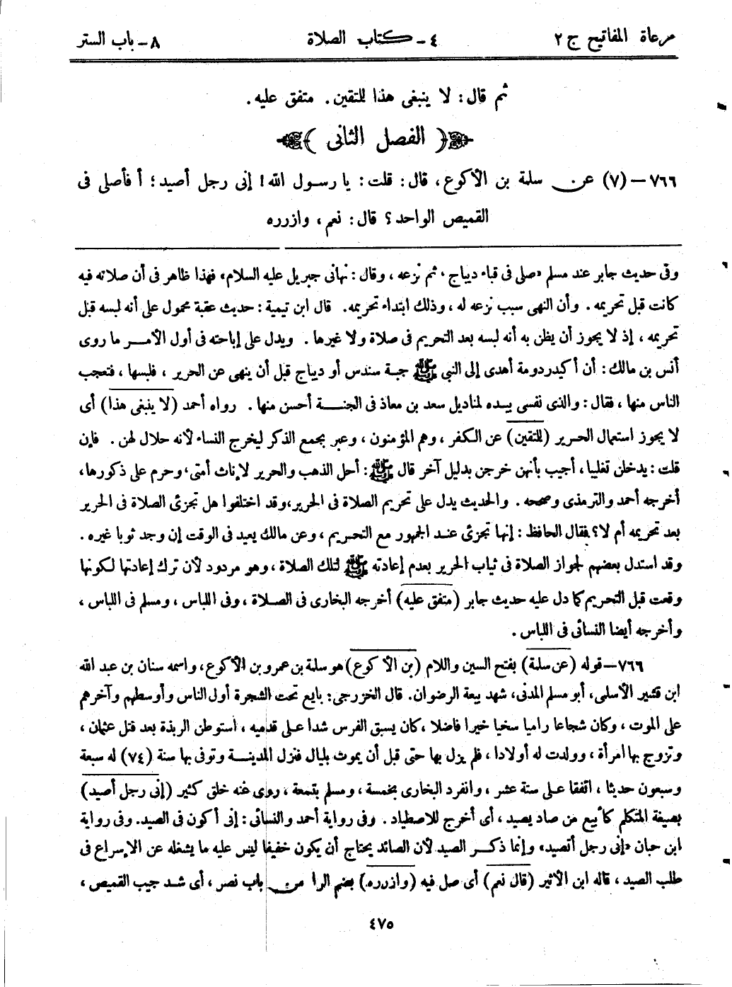 766- (7) عن سلمة بن الأكوع، قال قلت: ((يارسول الله! إني رجل أصيد؛ أفأصلي في القميص الواحد؟ قال: نعم، وازرره