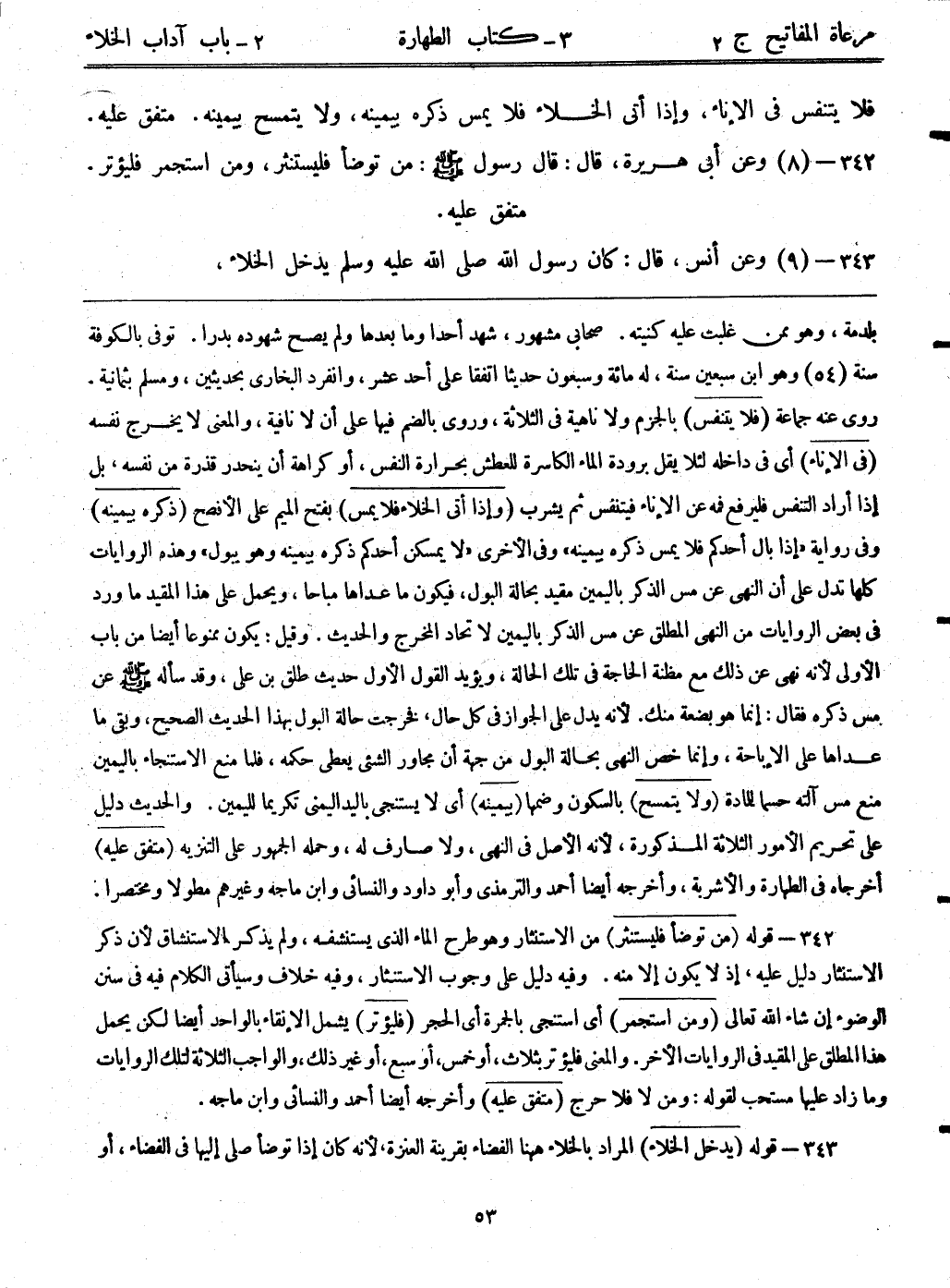 بلدمة، وهو ممن غلبت عليه كنيته. صحابي مشهور، شهد أحداً وما بعدها ولم يصح شهوده بدراً. توفي بالكوفة سنة (54) وهو ابن سبعين سنة، له مائة وسبعون حديثاً، اتفقا على أحد عشر، وانفرد البخاري بحديثين، ومسلم بثمانية. روى عنه جماعة. (فلا يتنفس) بالجزم ولا ناهية في الثلاثة، وروى بالضم فيها على أن لا نافية، والمعنى لا يخرج نفسه. (في الإناء) أي في داخله لئلا يقل برودة الماء الكاسرة للعطش بحرارة النفس، أو كراهة أن ينحدر قذرة من نفسه، بل إذا أراد التنفس فليرفع فمه عن الإناء فيتنفس ثم يشرب. (وإذا أتى الخلاء فلا يمس) بفتح الميم على الأفصح. (ذكره بيمينه) وفي رواية "إذا بال أحدكم فلا يمس ذكره بيمينه" وفي الأخرى "لا يمسكن أحدكم ذكره بيمينه وهو يبول". وهذه الروايات كلها تدل على أن النهي عن مس الذكر باليمين مقيد بحالة البول، فيكون ما عداها مباحاً، ويحمل على هذا المقيد ما ورد في بعض الروايات من النهي المطلق عن مس الذكر باليمين لاتحاد المخرج والحديث. وقيل: يكون ممنوعاً أيضاً من باب الأولى؛ لأنه نهى عن ذلك مع مظنة الحاجة في تلك الحالة، ويؤيد القول الأول حديث طلق بن علي، وقد سأل - صلى الله عليه وسلم - عن مس ذكره فقال: إنما هو بضعة منك؛ لأنه يدل على الجواز في كل حال، فخرجت حالة البول بهذا الحديث الصحيح، وبقي ما عداها على الإباحة، وإنما خص النهي بحالة البول من جهة أن مجاور الشيء يعطي حكمه، فلما منع الاستنجاء باليمين منع مس آلته حسما للمادة. (ولا يتمسح) بالسكون وضمها. (بيمينه) أي لا يستنجي باليد اليمنى تكريماً لليمين. والحديث دليل على تحريم الأمور الثلاثة المذكورة؛ لأنه الأصل في النهي، ولا صارف له، وحمله الجمهور على التنزيه. (متفق عليه) أخرجاه في الطهارة والأشربة، وأخرجه أيضاً أحمد والترمذي وأبوداود والنسائي وابن ماجه وغيرهم مطولاً ومختصراً.