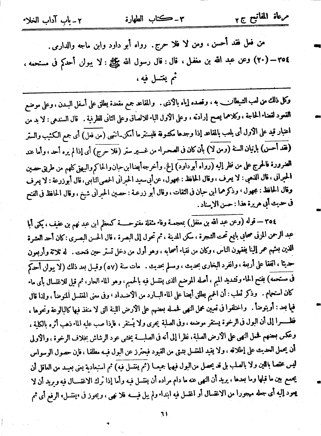 354- قوله: (وعن عبد الله بن مغفل) بمعجمه وفاء مثقلة مفتوحة كمعظم ابن عبد نهم بن عفيف، يكنى أبا عبد الرحمن المزني صحابي بايع تحت الشجرة، سكن المدينة، ثم تحول إلى البصرة، قال الحسن البصري: كان أحد العشرة الذين بعثهم عمر إلينا يفقهون الناس، وكان من نقباء أصحابه، وهو أول من دخل تستر حين فتحت. له ثلاثة وأربعون حديثاً، اتفقا على أربعة، وانفرد البخاري بحديث، ومسلم بحديث. مات سنة (57) ، وقيل: بعد ذلك. (لا يبولن أحدكم في مستحمة) بفتح الحاء وتشديد الميم، أصله الموضع الذي يغتسل فيه بالحميم، وهو الماء الحار، ثم قيل للاغتسال بأي ماء كان استحمام. وذكر ثعلب: أن الحميم يطلق أيضاً على الماء البارد من الأضداد، وفي معنى المغتسل المتوضأ، ولذا قال فيما بعد: أو يتوضأ. واختلفوا في تعيين محمل النهي، فحمله بعضهم على الأرض اللينة التي لا منفذ فيها كالبالوعة ونحوها، نظراً إلى أن البول في الرخوة يستقر موضعه، وفي الصلبة يجرى ولا يستقر، فإذا صب عليه الماء ذهب أثره بالكلية، وعكس بعضهم فحمل النهي على الأرض الصلبة، نظراً إلى أنه في الصلبة يخشى عود الرشاش بخلاف الرخوة، والأولى أن يحمل الحديث على إطلاقه، ولا يقيد المغتسل بشيء من القيود فيحترز عن البول فيه مطلقاً، فإن حصول الوسواس ليس مختصاً باللين ولا بالصلب بل قد يحصل من البول فيهما جميعاً. (ثم يغتسل فيه) ثم استبعادية يعني بعيد من العاقل أن يجمع بين ما قبلها وما بعدها، يريد أن النهي عنه ما دام مراه أن يغتسل فيه وأما إذا ترك الاغتسال فيه ويريد أن لا يعود إليه أي جعله مهجوراً من الاغتسال أو اغتسل فيه ابتداء ولم يبل فيه فلا نهي، ويجوز في "يغتسل" الرفع أي ثم