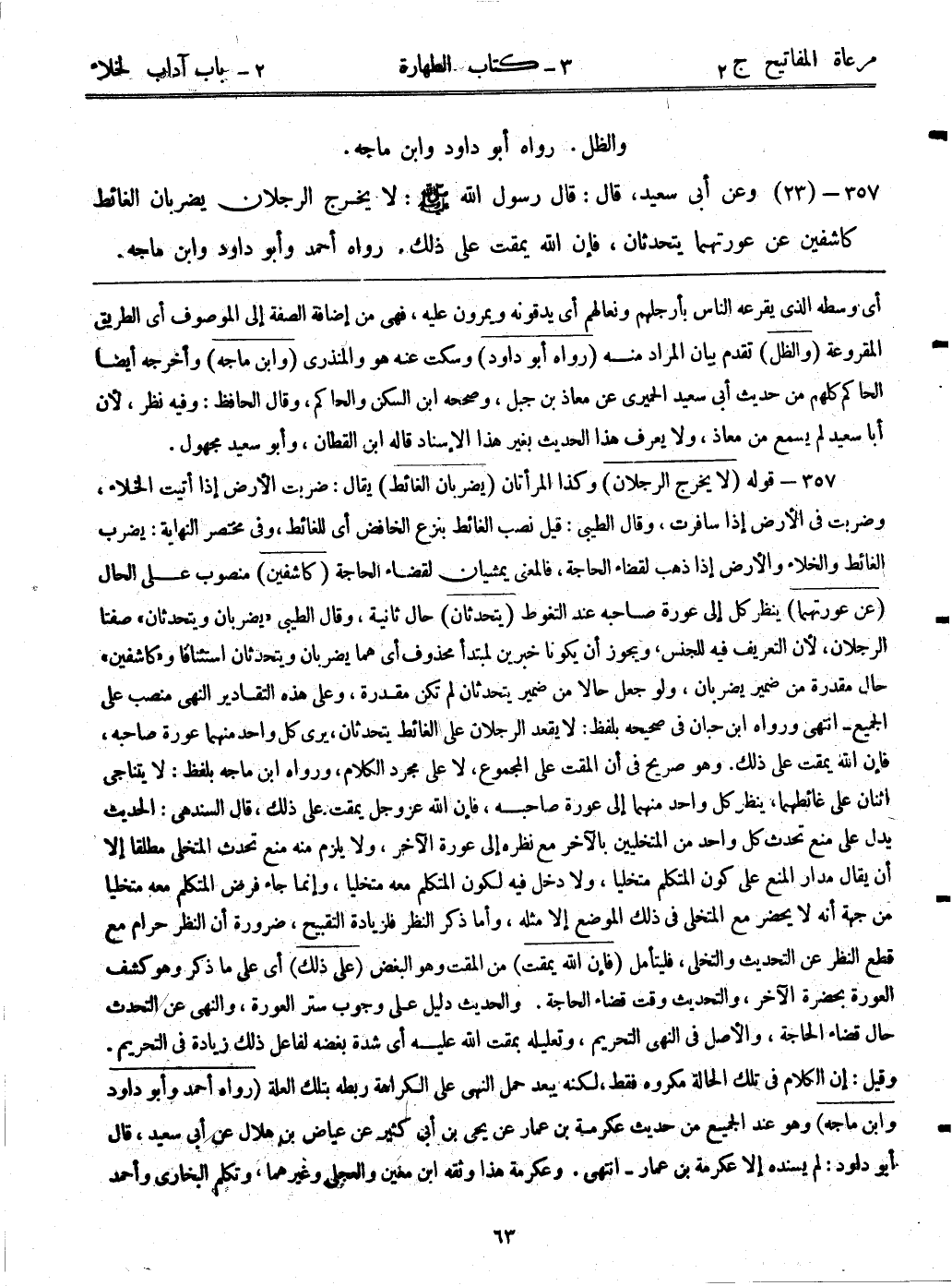357- (23) وعن أبي سعيد، قال: قال رسول الله - صلى الله عليه وسلم -: ((لا يخرج الرجلان يضربان الغائط كاشفين عن عورتهما يتحدثان، فإن الله يمقت على ذلك)) رواه أحمد وأبوداود وابن ماجه.