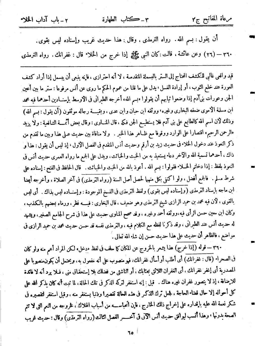 360- قوله: (إذا خرج) هذا يشعر بالخروج عن المكان كما سلف في لفظ "دخل" لكن المراد أعم منه ولو كان في الصحراء. (قال: غفرانك) أي طلب أو أسأل غفرانك. فهو منصوب على أنه مفعول به، ويحتمل أن يكون منصوباً على المصدرية أي الغفران اللائق بجنابك، أو الناشئ من فضلك بلا إستحقاق مني، فلا يرد أنه لا فائدة للإضافة، إذ لا يتصور غفران غيره هناك. قيل: إنه استغفر لتركه الذكر في تلك الحالة، لما ثبت أنه كان يذكر الله على كل أحواله إلا حال قضاء الحاجة، فجعل ترك الذكر في هذه الحالة تقصيراً وذنباً يستغفر منه، وقيل: استغفر لتقصيره في شكر نعمة الله عليه بإقداره على إخراج ذلك الخارج، فإن انحباسه من أسباب الهلاك، فخروجه من النعم التي لا تتم الصحة بدونها، وهذا أنسب ليوافق حديث أنس الآتي في آخر الفصل الثالث. (رواه الترمذي) وقال: حديث غريب