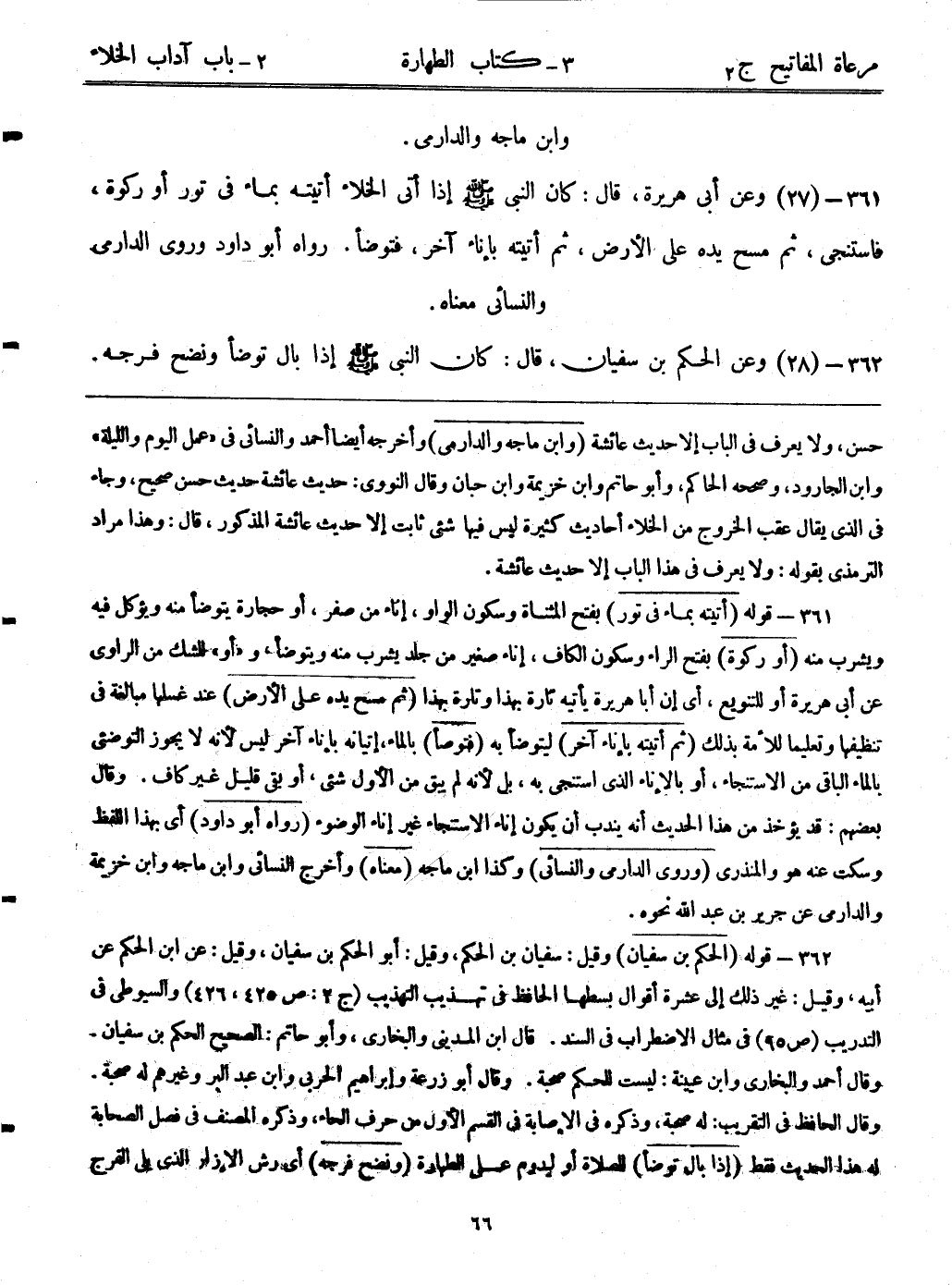 361- (27) وعن أبي هريرة، قال: ((كان النبي - صلى الله عليه وسلم - إذا أتى الخلاء أتيته بماء في تور أو ركوة، فاستنجى، ثم مسح يده على الأرض، ثم أتيته بإناء آخر، فتوضأ)) رواه أبوداود وروى الدارمي والنسائي معناه.