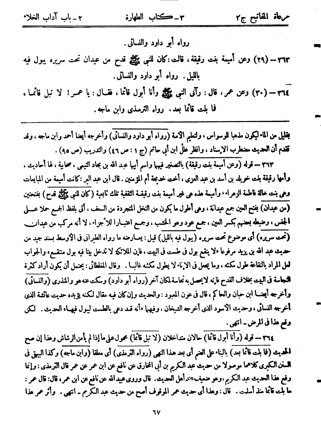 364- (30) وعن عمر، قال: ((رآني النبي - صلى الله عليه وسلم - وأنا أبول قائماً، فقال: يا عمر لا تبل قائماً، فما بلت قائماً بعد)) رواه الترمذي وابن ماجه.