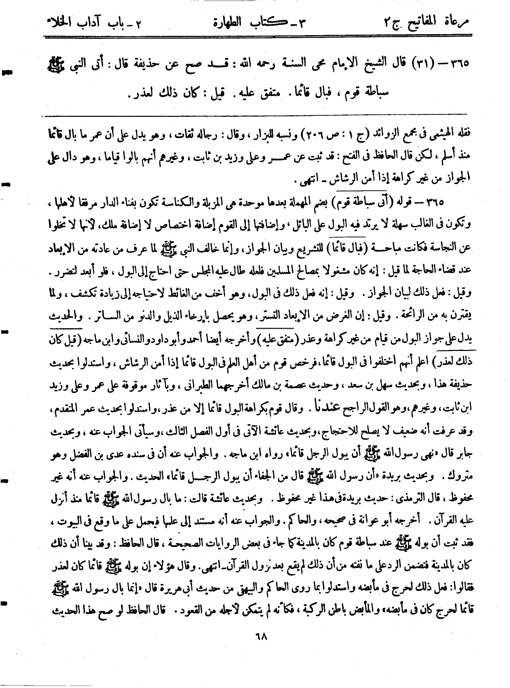 365- (31) قال الشيخ الإمام محي السنة رحمه الله: قد صح عن حذيفة قال: ((أتى النبي - صلى الله عليه وسلم - سباطة قوم، فبال قائماً)) متفق عليه. قيل: كان ذلك لعذر.