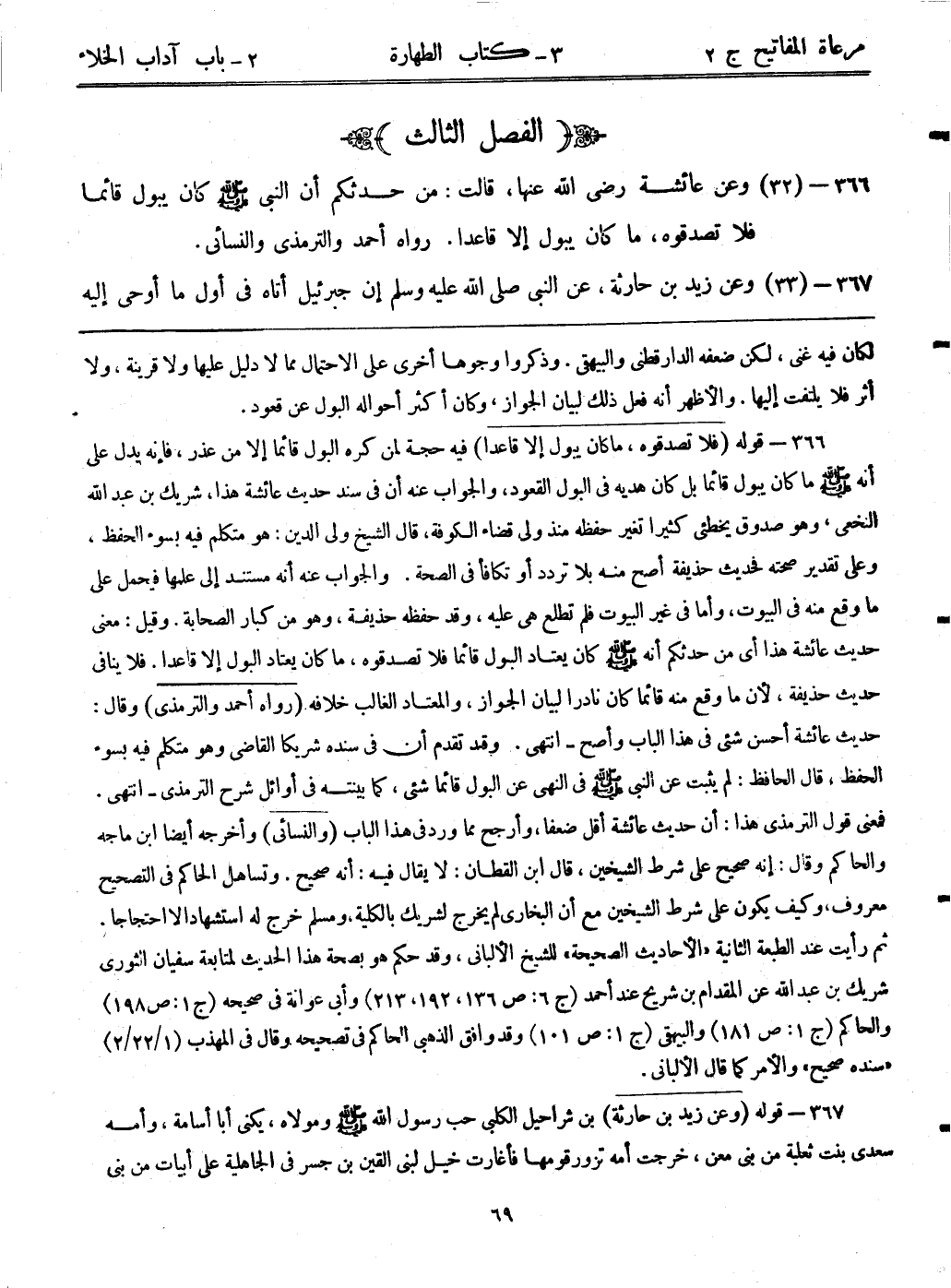 366- (32) وعن عائشة رضي الله عنها، قالت: ((من حدثكم أن النبي - صلى الله عليه وسلم - كان يبول قائماً فلا تصدقوه، ما كان يبول إلا قاعداً)) رواه أحمد والترمذي والنسائي.