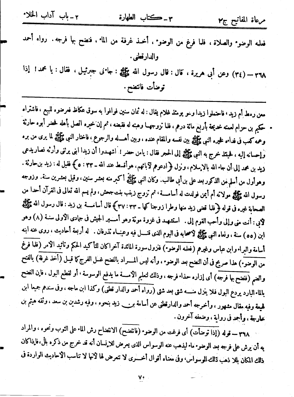 368- (34) وعن أبي هريرة، قال: قال رسول الله - صلى الله عليه وسلم -: ((جاءني جبرئيل، فقال: يا محمد إذا توضأت فانتضح))