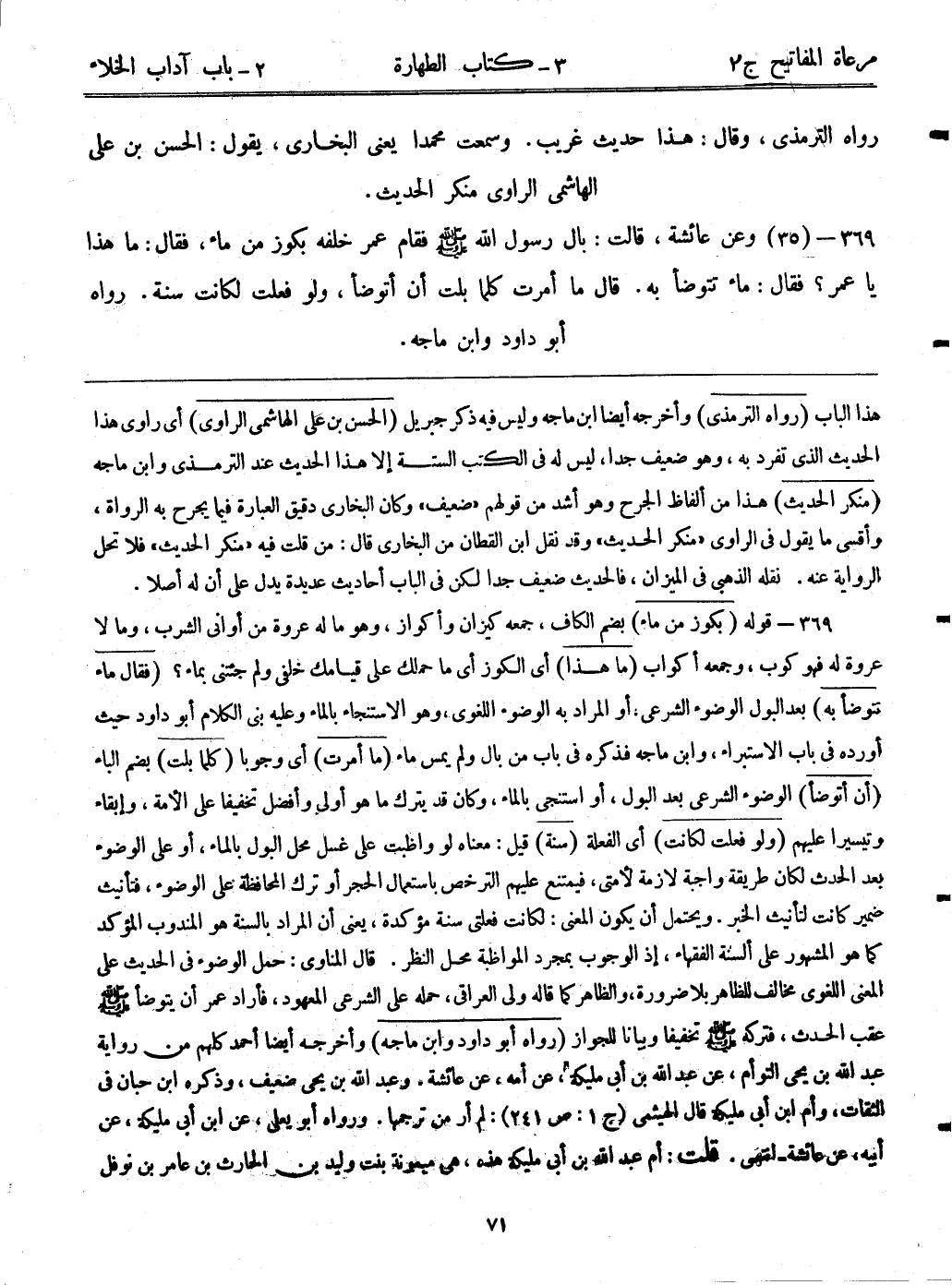 369- (35) وعن عائشة، قالت: ((بال رسول الله - صلى الله عليه وسلم - فقام عمر خلفه بكوز من ماء، فقال: ما هذا ياعمر؟ فقال: ماء تتوضأ به. قال: ما أمرت كلما بلت أن أتوضأ، ولو فعلت لكانت سنة)) وراه أبوداود وابن ماجه.