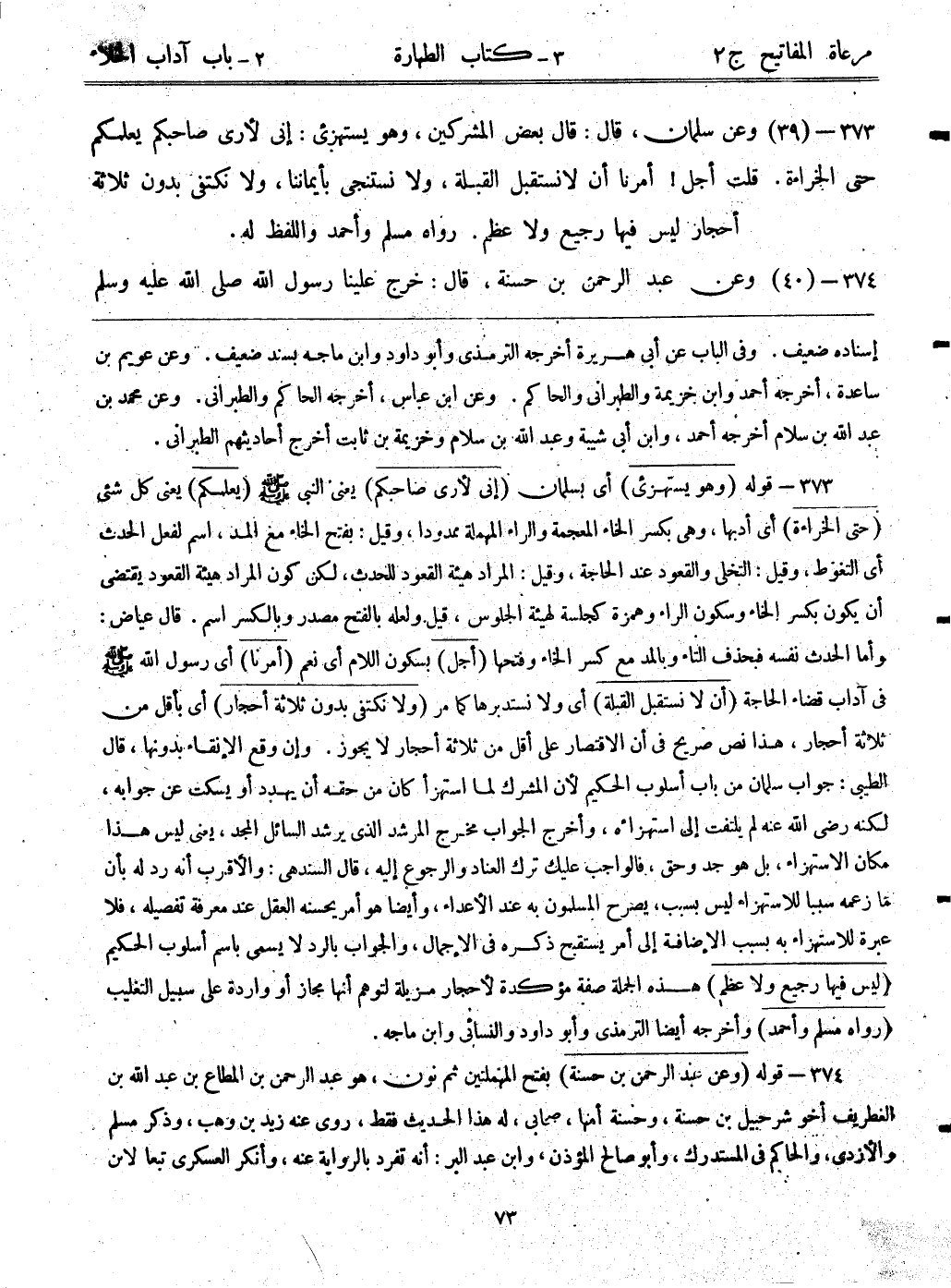 373- قوله: (وهو يستهزئ) أي بسلمان. (إني لأرى صاحبكم) يعني النبي - صلى الله عليه وسلم -. (يعلمكم) يعني كل شيء. (حتى الخراءة) أي أدبها، وهي بكسر الخاء المعجمة والراء المهملة ممدوداً، وقيل: بفتح الخاء مع المد، اسم لفعل الحدث أي التغوط، وقيل: التخلي والقعود عند الحاجة، وقيل: المراد هيئة القعود للحدث، لكن كون المراد هيئة القعود يقتضي أن يكون بكسر الخاء وسكون الراء وهمزة كجلسة لهيئة الجلوس، قيل: ولعله بالفتح مصدر وبالسكر اسم. قال عياض: وأما الحدث نفسه فبحذف التاء وبالمد مع كسر الخاء وفتحها. (أجل) بسكون اللام أي نعم. (أمرنا) أي رسول الله - صلى الله عليه وسلم - في آداب قضاء الحاجة. (أن لا نستقبل القبلة) أي ولا نستدبرها كما مر. (ولا نكتفي بدون ثلاثة أحجار) أي بأقل من ثلاثة أحجار، هذا نص صريح في أن الاقتصار على أقل من ثلاثة أحجار لا يجوز. وإن وقع الإنقاء بدونها، قال الطيبي: جواب سلمان من باب أسلوب الحكيم؛ لأن المشرك لما استهزأ كان من حقه أن يهدد أو يسكت عن جوابه، لكنه رضي الله عنه لم يلتفت إلى استهزائه، وأخرج الجواب مخرج المرشد الذي يرشد السائل المجد، يعني ليس هذا مكان الاستهزاء، بل هو جد وحق، فالواجب عليك ترك العناد والرجوع إليه، قال السندهي: والأقرب أنه رد له بأن ما زعمه سبباً للاستهزاء ليس بسبب يصرح المسلمون به عند الأعداء، وأيضاً هو أمر يحسنه العقل عند معرفة تفصيله، فلا عبرة للاستهزاء به بسبب الإضافة إلى أمر يستقبح ذكره في الإجمال، والجواب بالرد لا يسمى باسم أسلوب الحكيم. (ليس فيها رجيع ولا عظم) هذه الجملة صفة مؤكدة لأحجار مزيلة لتوهم أنها مجاز أو واردة على سبيل التغليب. (رواه مسلم وأحمد) وأخرجه أيضاً الترمذي وأبوداود والنسائي وابن ماجه.