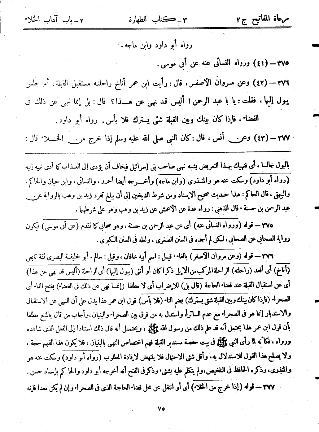 376- (42) وعن مروان الأصفر، قال: ((رأيت ابن عمر أناخ راحلته مستقبل القبلة، ثم جلس يبول إليها، فقلت: يا أبا عبد الرحمن أليس قد نهى عن هذا؟ قال: بل إنما نهي عن ذلك في الفضاء، فإذا كان بينك وبين القبلة شيء يسترك فلا بأس)) رواه أبوداود.