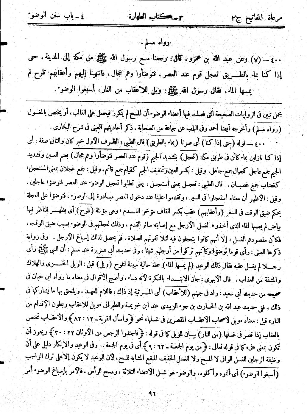 400- قوله: (حتى إذا كنا) أي صرنا. (بماء بالطريق) قال الطيبي: الظرف الأول خبر كان والثاني صفة، أي إذا كنا نازلين بماء كائن في طريق مكة. (تعجل) بتشديد الجيم. (قوم عند العصر فتوضؤوا وهم عجال) بضم العين وتشديد الجيم. جمع عاجل كجهال جمع جاهل. وقيل: بكسر العين وتخفيف الجيم كقيام جمع قائم، وقيل: جمع عجلان بمعنى المستعجل، وكغضاب جمع غضبان. قال الطيبي: تعجل بمعنى استعجل، يعني تطلبوا تعجيل الوضوء عند العصر فتوضؤوا عاجلين. وقيل: الأظهر أن معناه استعجلوا في السير، وتقدموا علينا عند دخول العصر مبادرة إلى الوضوء، فتوضؤا على العجلة بحكم ضيق الوقت في السفر. (وأعقابهم) عقب بكسر القاف مؤخر القدم، وهي مؤنثة (تلوح) أي يظهر للناظر فيها بياض لم يصبها الماء الذي أخذوه لغسل الأرجل مع إصابته سائر القدم، وذلك لعجلتهم في الوضوء بسب ضيق الوقت، فكأن مقصودهم الغسل، إلا أنهم كانوا يتعجلون فيه لئلا تفوتهم الصلاة، فلم يحصل لذلك إسباغ الأرجل. وفي رواية ذكرها العيني: رأى قوماً توضؤوا وكأنهم تركوا من أرجلهم شيئا، وفي حديث أبي هريرة عند مسلم: أن النبي - صلى الله عليه وسلم - رأى رجلاً لم يغسل عقبه فقال ذلك الوعيد. (لم يمسها الماء) جملة حالية مبنية لتلوح. (ويل) قيل: الويل الخزى والهلاك والمشقة من العذاب. قال الأبهري: جاز الابتداء بالنكرة لأنه دعاء، وأصح الأقوال في معناه ما رواه ابن حبان في صحيحه من حديث أبي سعيد: واد في جهنم. (للأعقاب) أي المرئية إذ ذاك، فاللام للعهد، ويلتحق بها ما يشاركها في ذلك، ففي حديث عبد الله بن الحارث بن جزء الزبيدي عند ابن خزيمة والطبراني "ويل للاعقاب وبطون الأقدام من النار". قيل: معناه "ويل لأصحاب الأعقاب المقصرين في غسلها" نحو {واسأل القرية} [82:12] والأعقاب تختص بالعقاب إذا قصر في غسلها. (من النار) بيان للويل كما في قوله: {فاجتنبوا الرجس من الأوثان} [30:22] ويجوز أن تكون بمعنى "في" كما في قوله تعالى: {من يوم الجمعة} [9:62] أي في يوم الجمعة. وفي الوعيد والإنكار دليل على أن وظيفة الرجلين الغسل الوافي لا المسح، ولا الغسل الخفيف المبقع المشابه للمسح، لأن الوعيد لا يكون إلا على ترك الواجب. (أسبغوا الوضوء) أي أتموه وأكملوه، والوضوء هو غسل الأعضاء الثلاثة، ومسح الرأس، فالأمر بإسباغ الوضوء أمر
