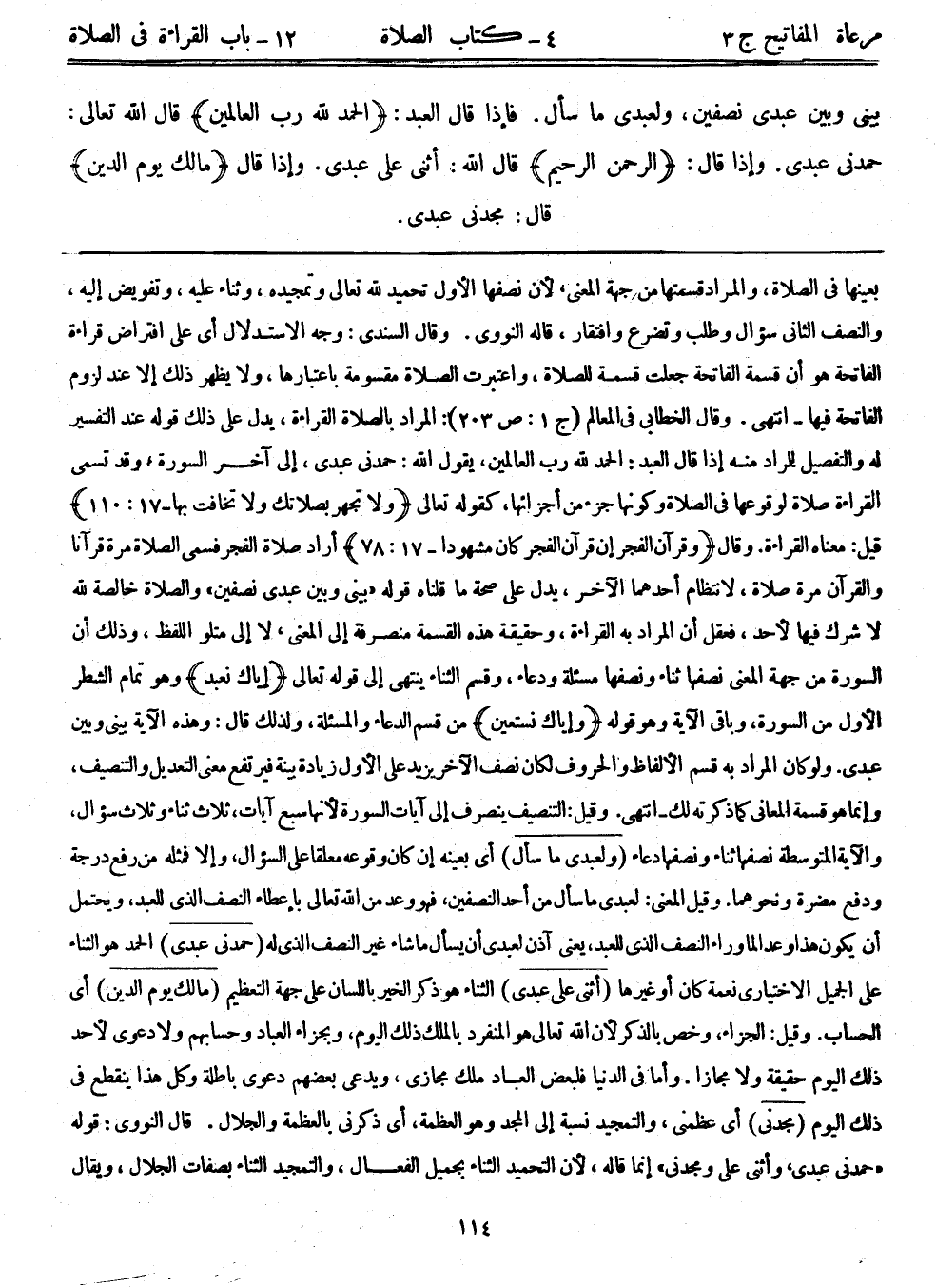 بعينها في الصلاة، والمراد قسمتها من جهة المعنى؛ لأن نصفها الأول تحميد لله تعالى وتمجيده، وثناء عليه، وتفويض إليه، والنصف الثاني سؤال وطلب وتضرع وافتقار، قاله النووي. وقال السندي: وجه الاستدلال أي على افتراض قراءة الفاتحة هو أن قسمة الفاتحة جعلت قسمة للصلاة، واعتبرت الصلاة مقسومة باعتبارها، ولا يظهر ذلك إلا عند لزوم الفاتحة فيها-انتهى. وقال الخطابي في المعالم (ج1: ص203) : المراد بالصلاة القراءة، يدل على ذلك قوله عند التفسير له والتفصيل للمراد منه إذا قال العبد: الحمد لله رب العالمين، يقول الله: حمدني عبدي، إلى آخر السورة، وقد تسمى القراءة صلاة لوقوعها في الصلاة وكونها جزءاً من أجزائها، كقوله تعالى: {ولا تجهر بصلاتك ولا تخافت بها} [17: 110] قيل: معناه القراءة. وقال: {وقرآن الفجر إن قرآن الفجر كان مشهوداً} [78: 17] أراد صلاة الفجر فسمى الصلاة مرة قرآناً والقرآن مرة صلاة، لانتظام أحدهما الآخر، يدل على صحة ما قلناه قوله: "بيني وبين عبدي نصفين" والصلاة خالصة لله لا شرك فيها لأحد، فعقل أن المراد به القراءة، وحقيقة هذه القسمة منصرفة إلى المعنى، لا إلى متلو اللفظ، وذلك أن السورة من جهة المعنى نصفها ثناء ونصفها مسألة ودعاء، وقسم الثناء ينتهي إلى قوله تعالى: {إياك نعبد} وهو تمام الشطر الأول من السورة، وباقي الآية وهو قوله: {وإياك نستعين} من قسم الدعاء والمسألة، ولذلك قال: وهذه الآية بيني وبين عبدي. ولو كان المراد به قسم الألفاظ والحروف لكان نصف الآخر يزيد على الأول زيادة بينه فيرتفع معنى التعديل والتنصيف، وإنما هو قسمة المعاني كما ذكرته لك-انتهى. وقيل: التنصيف ينصرف إلى آيات السورة؛ لأنها سبع آيات، ثلاث ثناء وثلاث سؤال، والآية المتوسطة نصفها ثناء ونصفها دعاء. (ولعبدي ما سأل) أي بعينه إن كان وقوعه معلقاً على السؤال، وإلا فمثله من رفع درجة ودفع مضرة ونحوهما. وقيل المعنى: لعبدي ما سأل من أحد النصفين، فهو وعد من الله تعالى بإعطاء النصف الذي للعبد، ويحتمل أن يكون هذا وعداً لما وراء النصف الذي للعبد، يعني آذن لعبدي أن يسأل ما شاء غير النصف الذي له. (حمدني عبدي) الحمد هو الثناء على الجميل الاختياري نعمة كان أو غيرها. (أثنى على عبدي) الثناء هو ذكر الخير باللسان على جهة التعظيم. (مالك يوم الدين) أي الحساب. وقيل: الجزاء، وخص بالذكر لأن الله تعالى هو المنفرد بالملك ذلك اليوم، ويجزاء العباد وحسابهم، ولا دعوى لأحد ذلك اليوم حقيقة ولا مجازا. وأما في الدنيا فلبعض العباد ملك مجازي، ويدعى بعضهم دعوى باطلة وكل هذا ينقطع في ذلك اليوم. (مجدني) أي عظمني، والتمجيد نسبة إلى المجد وهو العظمة، أي ذكرني بالعظمة والجلال. قال النووي: قوله: "حمدني عبدي" وأثنى على ومجدني" إنما قاله؛ لأن التحميد الثناء بجميل الفعال، والتمجيد الثناء بصفات الجلال، ويقال: