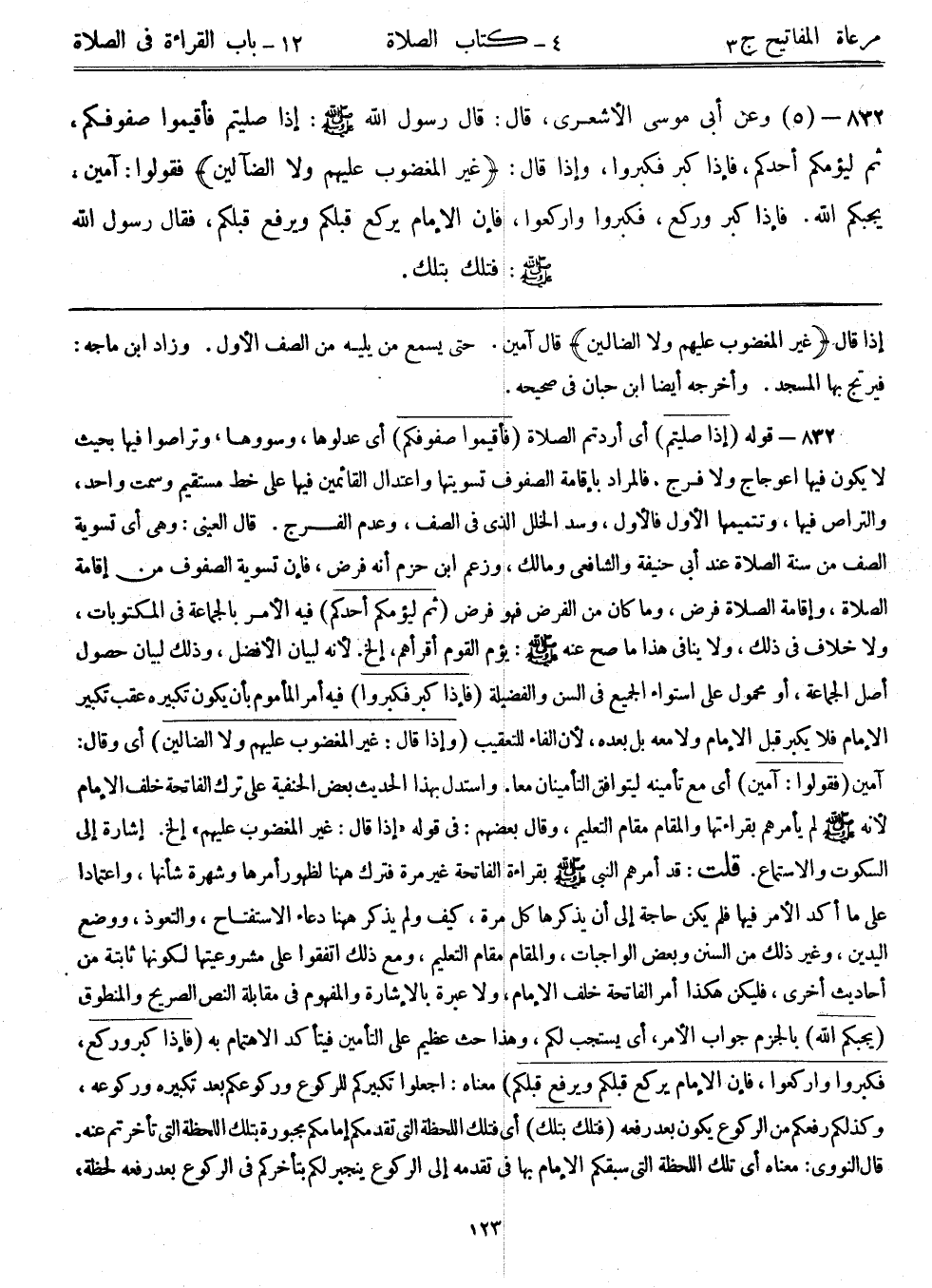 832- (5) وعن أبي موسى الأشعري، قال: ((قال رسول الله - صلى الله عليه وسلم -: إذا صليتم فأقيموا صفوفكم، ثم ليؤمكم أحدكم، فإذا كبر فكبروا، وإذا قال: غير المغضوب عليهم ولا الضالين فقولوا: آمين؛ يحبكم الله. فإذا كبر وركع، فكبروا واركعوا، فإن الإمام يركع قبلكم ويرفع قبلكم، فقال رسول الله - صلى الله عليه وسلم -: فتلك بتلك)) .