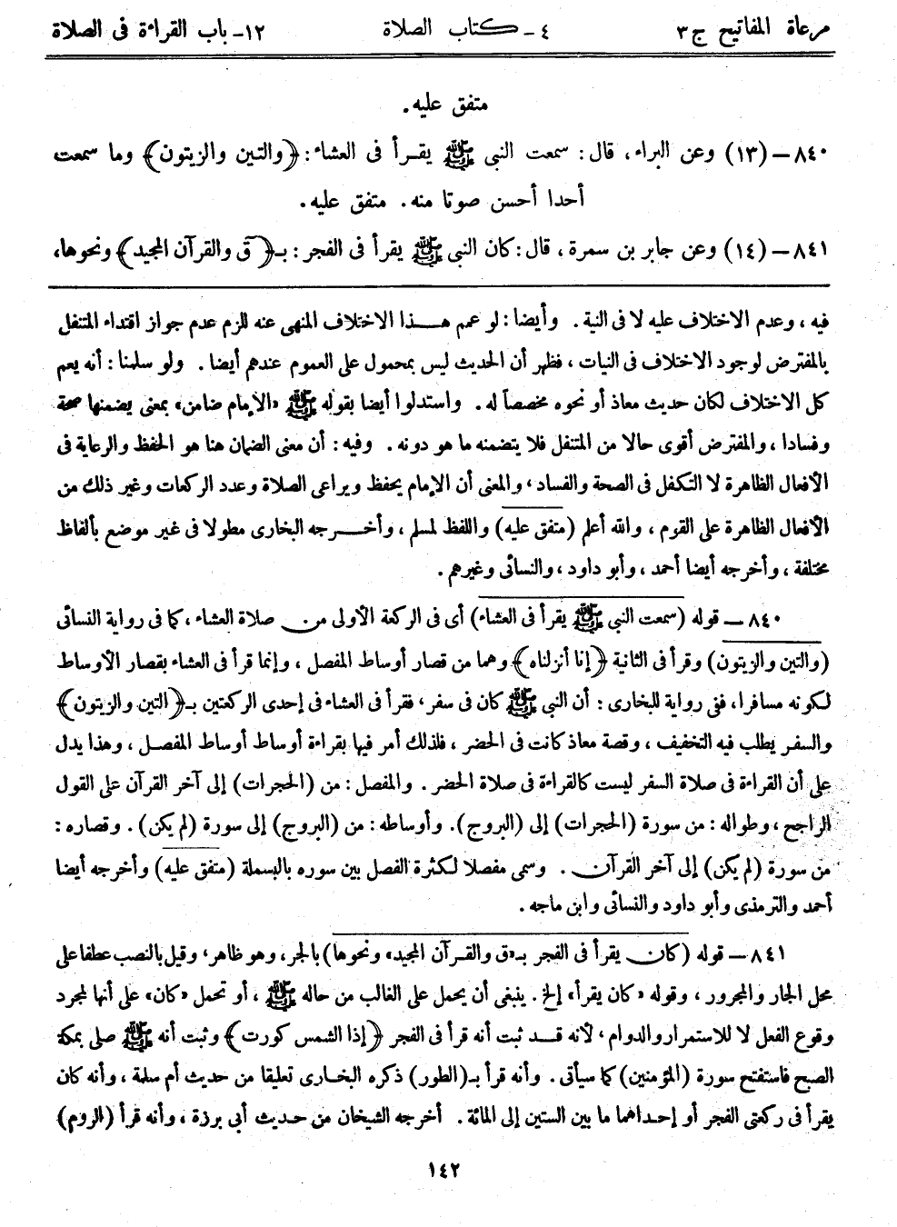 840- (13) وعن البراء، قال: ((سمعت النبي - صلى الله عليه وسلم - يقرأ في العشاء: {والتين والزيتون} وما سمعت