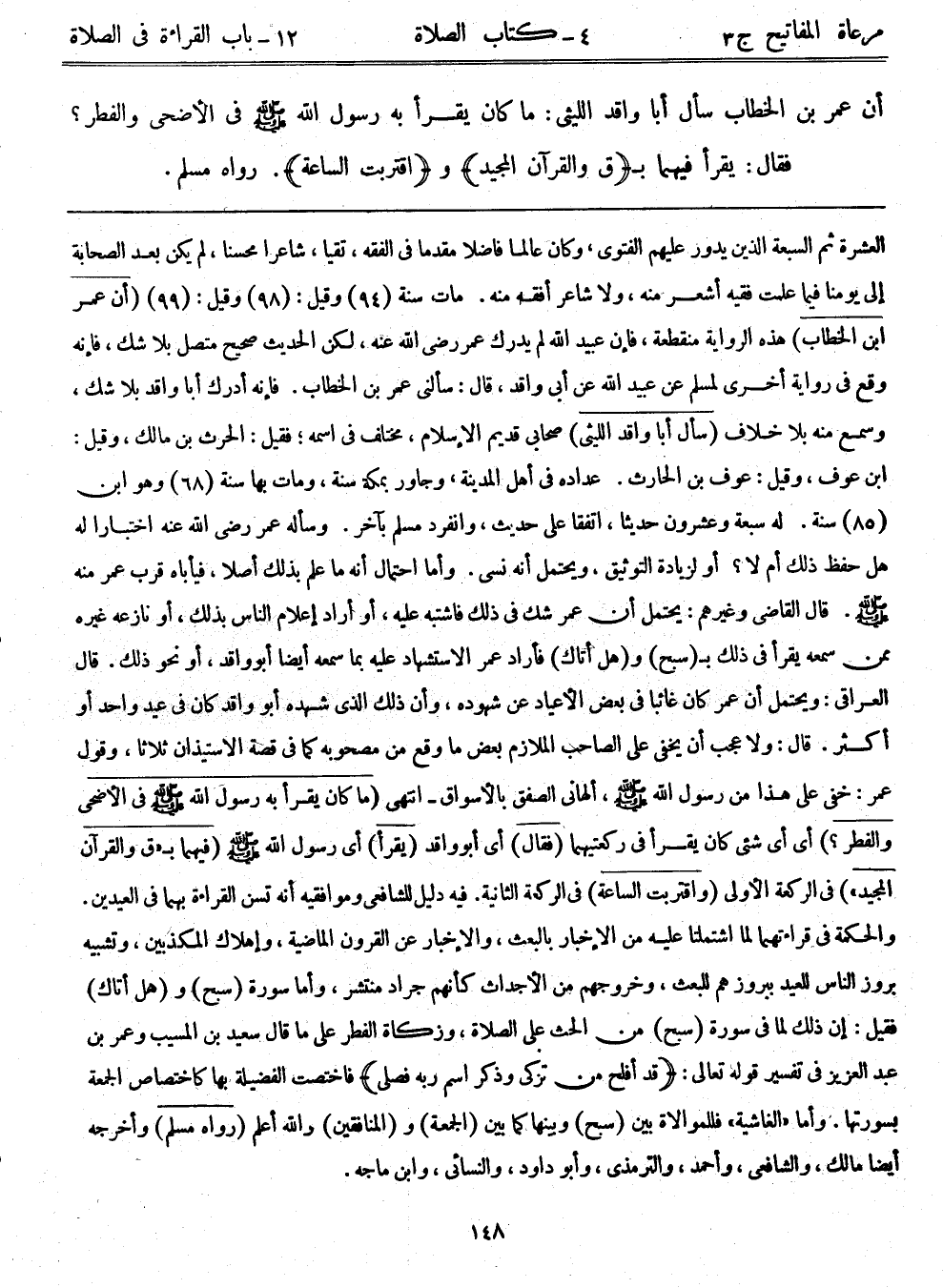 العشرة ثم السبعة الذين يدور عليهم الفتوى، وكان عالماً فاضلاً مقدماً في الفقه، تقياً، شاعراً محسناً، لم يكن بعد الصحابة إلى يومنا فيما علمت فقيه أشهر منه، ولا شاعر أفقه منه. مات سنة (94) وقيل: (98) وقيل: (99) . (أن عمر بن الخطاب) هذه الرواية منقطعة، فإن عبيد الله لم يدرك عمر - رضي الله عنه -، لكن الحديث صحيح متصل بلا شك، فإنه وقع في رواية أخرى لمسلم عن عبيد الله عن أبي واقد، قال: سألني عمر بن الخطاب. فإنه أدرك أباواقد بلا شك، وسمع منه بلا خلاف. (سأل أباواقد الليثى) صحابي قديم الإسلام، مختلف في اسمه؛ فقيل: الحارث بن مالك، وقيل: ابن عوف، وقيل: عوف بن الحارث. عداده في أهل المدينة، وجاور بمكة سنة، ومات بها سنة (68) وهو ابن (85) سنة. له سبعة وعشرون حديثاً، اتفقا على حديث، وانفرد مسلم بآخر. وسأله عمر رضي الله عنه اختباراً له هل حفظ ذلك أم لا؟ أو لزيادة التوثيق، ويحتمل أنه نسي. وأما الاحتمال أنه ما علم بذلك أصلاً، فيأباه قرب عمر منه - صلى الله عليه وسلم -. قال القاضي وغيرهم: يحتمل أن عمر شك في ذلك فاشتبه عليه، أو أراد إعلام الناس بذلك، أو نازعه غيره ممن سمعه يقرأ في ذلك بـ (سبح) و (هل أتاك) فأراد عمر الاستشهاد عليه بما سمعه أيضاً أبوواقد، أو نحو ذلك. قال العراقي: ويحتمل أن عمر كان غائباً في بعض الأعياد عن شهوده، وأن ذلك الذي شهده أبوواقد كان في عيد واحد أو أكثر. قال: ولا عجب أن يخفى على الصاحب الملازم بعض ما وقع من مصحوبة كما في قصة الاستئذان ثلاثاً، وقول عمر: خفي علي هذا من رسول الله - صلى الله عليه وسلم -، ألهاني الصفق بالأسواق- انتهى. (ما كان يقرأ به رسول الله - صلى الله عليه وسلم - في الأضحى والفطر؟) أي شيء كان يقرأ في ركعتيهما. (فقال) أي أبوواقد. (يقرأ أي رسول الله - صلى الله عليه وسلم -. (فيهما بـ {ق والقرآن المجيد} ) في الركعة الأولى. (و {اقتربت الساعة} ) في الركعة الثانية. فيه دليل للشافعي وموافقيه أنه تسن القراءة بهما في العيدين. والحكمة في قراءتهما لما اشتملتا عليه من الإخبار بالبعث، والإخبار عن القرون الماضية، وإهلاك المكذبين، وتشبيه بروز الناس للعيد ببروزهم لبعث، وخروجهم من الأجداث كأنهم جراد منتشر، وأما سورة (سبح) و (هل أتاك) فقيل: إن ذلك لما في سورة (سبح) من الحث على الصلاة، وزكاة الفطر على ما قال سعيد بن المسيب وعمر بن عبد العزيز في تفسير قوله تعالى: {قد أفلح من تزكى وذكر اسم ربه فصلى} فاختصت الفضيلة بها كاختصاص الجمعة بسورتها. وأما: "الغاشية" فللموالاة بين (سبح) وبينا كما بين (الجمعة) و (المنافقين) والله أعلم. (رواه مسلم) وأخرجه أيضاً مالك، والشافعي، وأحمد، والترمذي، وأبوداود، والنسائي، وابن ماجه.