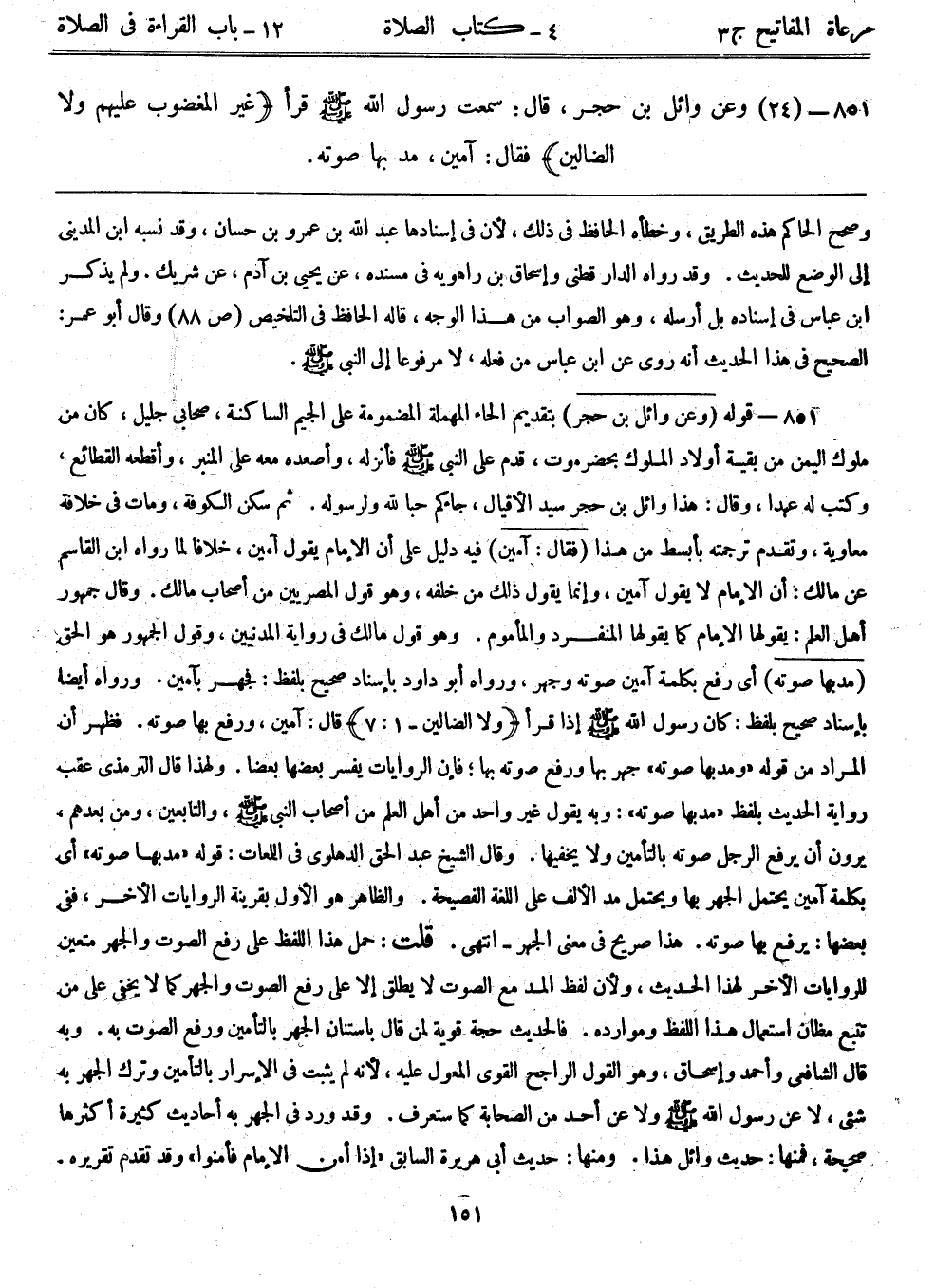 851- (24) وعن وائل بن حجر، قال: ((سمعت رسول الله - صلى الله عليه وسلم - قرأ {غير المغضوب عليهم ولا الضالين} فقال: آمين، مد بها صوته)) .