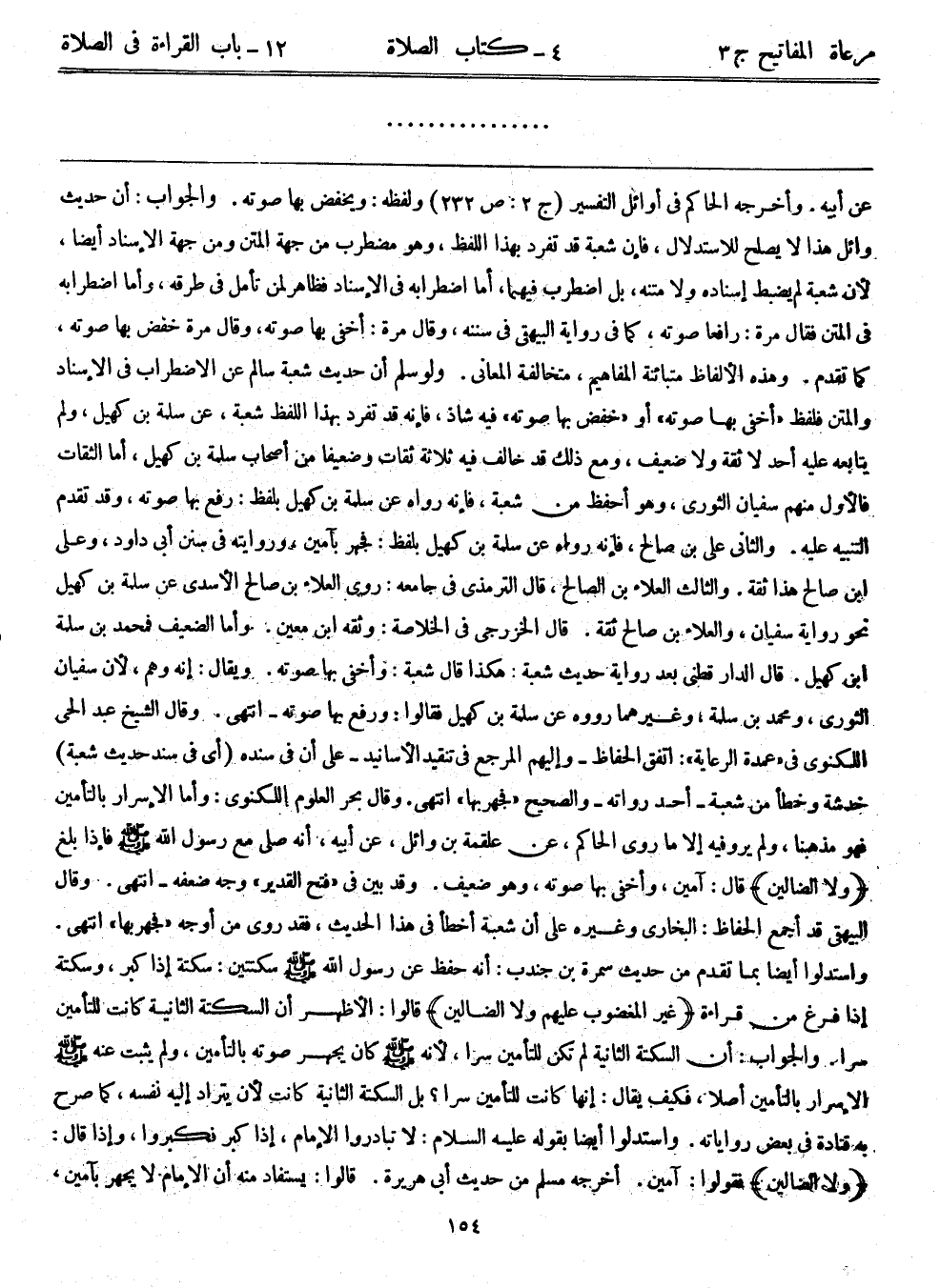 عن أبيه. وأخرجه الحاكم في أوائل التفسير (ج2: ص232) ولفظه: ويخفض بها صوته. والجواب: أن حديث وائل هذا لا يصلح للاستدلال، فإن الشعبة قد تفرد بهذا اللفظ، وهو مضطرب من جهة المتن ومن جهة الإسناد أيضاً، لأن شعبة لم يضبط إسناده ولا متنه، بل اضطرب فيهما، أما اضطرابه في الإسناد فظاهر لمن تأمل في طرقه، وأما اضطرابه في المتن فقال مرة: رافعاً صوته، كما في رواية البيهقي في سننه، وقال مرة: أخفى بها صوته، وقال مرة خفض بها صوته، كما تقدم. وهذه الألفاظ متباينة المفاهيم، متخالفة المعاني. ولو سلم أن حديث شعبة سالم عن الاضطراب في الإسناد والمتن فلفظ "أخفى بها صوته" أو "خفض بها صوته" فيه شاذ، فإنه قد تفرد بهذا اللفظ شعبة، عن سلمة بن كهيل، ولم يتابعه عليه أحد لا ثقة ولا ضعيف، ومع ذلك قد خالف فيه ثلاثة ثقات وضعيفاً من أصحاب سلمة بن كهيل، أما الثقات فالأول منهم سفيان الثوري، وهو أحفظ من شعبة، فإنه رواه عن سلمة بن كهيل بلفظ: "رفع بها صوته"، وقد تقدم التنبيه عليه. والثاني علي بن صالح، فإنه رواه عن سلمة بن كهيل بلفظ: فجهر بآمين، وروايته في سنن أبي داود، وعلي ابن صالح هذا ثقة. والثالث العلاء بن الصالح، قال الترمذي في جامعه: روى العلاء بن صالح الأسدي عن سلمة بن كهيل نحو رواية سفيان، والعلاء بن صالح ثقة. قال الخزرجي في الخلاصة: وثقه ابن معين. وأما الضعيف فمحمد بن سلمة بن كهيل. قال الدارقطني بعد رواية حديث شعبة: هكذا قال شعبة: وأخفى بها صوته. ويقال: إنه وهم، لأن سفيان الثوري، ومحمد بن سلمة، وغيرهما رووه عن سلمة بن كهيل فقالوا: ورفع بها صوته- انتهى. وقال الشيخ عبد الحي اللكنوي في "عمدة الرعاية" اتفق الحافظ – وإليهم المرجع في تنقيد الأسانيد – على أن في سنده (أى في سند حديث شعبة) خدشة وخطأ من شعبة- أحد رواته – والصحيح "فجهر بها" انتهى. وقال بحر العلوم اللكنوي: وأما الإسرار بالتأمين فهو مذهبنا، ولم يرو فيه إلا ما روى الحاكم، عن علقمة بن وائل، عن أبيه، أنه صلى مع رسول الله - صلى الله عليه وسلم - فإذا بلغ {ولا الضالين} قال: آمين، وأخفى بها صوته، وهو ضعيف. وقد بيّن في "فتح القدير" وجه ضعفه-انتهى. وقال البيهقي قد أجمع الحافظ: البخاري وغيره على أن شعبة أخطأ في هذا الحديث، فقد روى من أوجه "فجهر بها" انتهى. واستدلوا أيضاً بما تقدم من حديث سمرة بن جندب: أنه حفظ عن رسول الله - صلى الله عليه وسلم - سكتتين: سكتة إذا كبر، وسكتة إذا فرغ من قراءة (غير المغضوب عليهم ولا الضالين} قالوا: الأظهر أن السكتة الثانية كانت للتأمين سراً والجواب: أن السكتة الثانية لم تكن للتأمين سراً، لأنه - صلى الله عليه وسلم - كان يجهر صوته بالتأمين، ولم يثبت عنه - صلى الله عليه وسلم - الإسرار بالتأمين أصلاً، فكيف يقال: إنها كانت للتأمين سراً؟ بل السكتة الثانية كانت لأن يتراد إليه نفسه، كما صرح به قتادة في بعض رواياته. واستدلوا أيضاً بقوله عليه السلام: لا تبادروا الإمام، إذا كبر فكبروا، وإذا قال: {ولا الضالين} فقولوا: آمين. أخرجه مسلم من حديث أبي هريرة. قالوا: يستفاد منه أن الإمام لا يجهر بآمين،