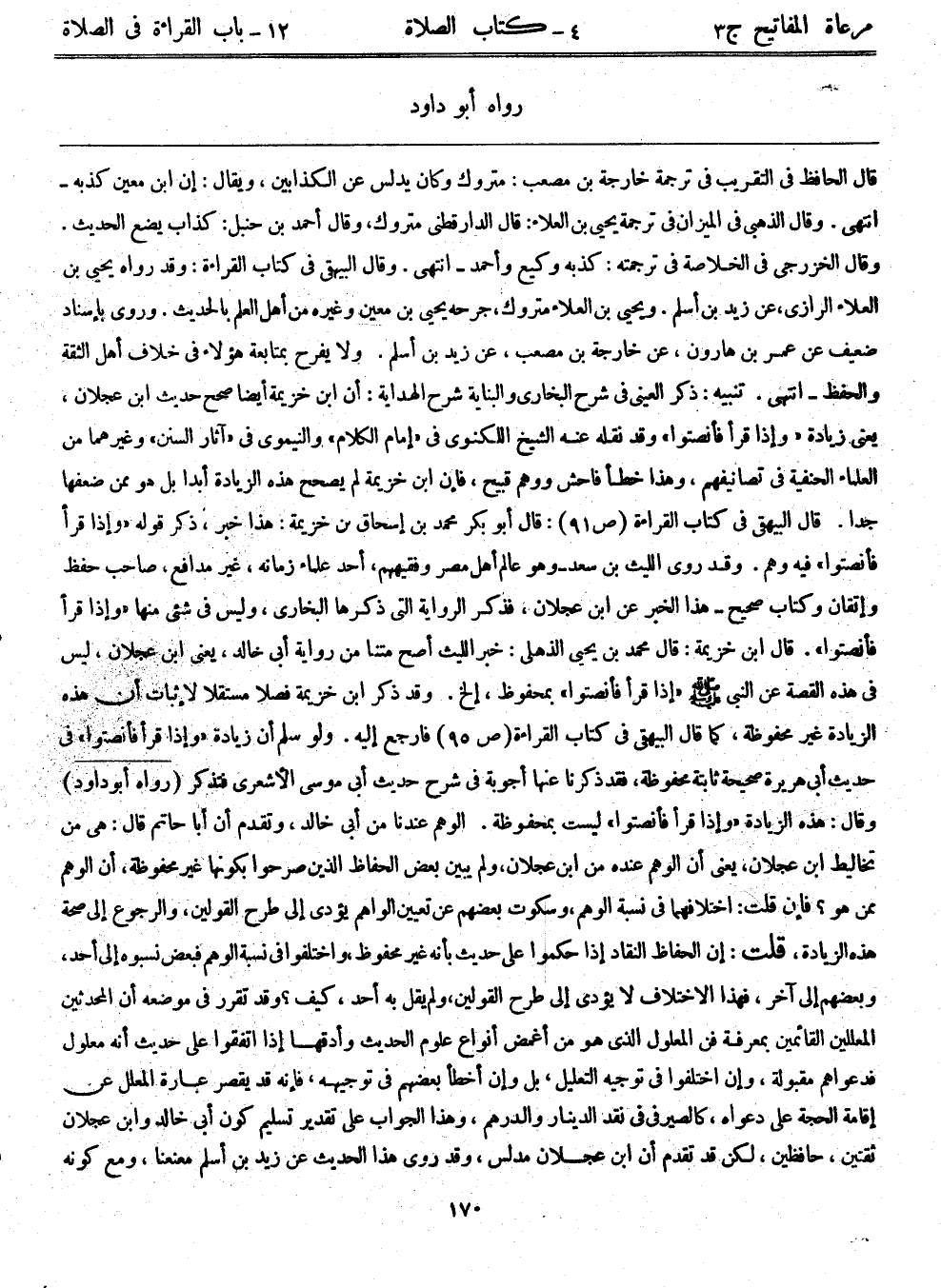 قال الحافظ في التقريب في ترجمة خارجة بن مصعب: متروك وكان يدلس عن الكذابين، ويقال: إن ابن معين كذبه-انتهى. وقال الذهبي في الميزان في ترجمة يحيى بن العلاء: قال الدارقطني: متروك، وقال أحمد بن حنبل: كذاب يضع الحديث. وقال الخزرجي في الخلاصة في ترجمته: كذبه وكيع وأحمد-انتهى. وقال البيهقي في كتاب القراءة: وقد رواه يحيى بن العلاء الرازي، عن زيد بن أسلم. ويحيى بن العلاء متروك، جرحه يحيى بن معين وغيره من أهل العلم بالحديث. وروي بإسناد ضعيف عن عمرو بن هارون، عن خارجة بن مصعب، عن زيد بن أسلم. ولا يفرح بمتابعة هؤلاء في خلاف أهل الثقة والحفظ –انتهى. تنبيه: ذكر العيني في شرح البخاري والبناية شرح الهداية: أن ابن خزيمة أيضاً صحح حديث ابن عجلان، يعني زيادة "وإذا قرأ فأنصتوا"، وقد نقله عنه الشيخ اللكنوي في "إمام الكلام"، والنيموي في "آثار السنن" وغيرهما من العلماء الحنفية في تصانيفهم، وهذا خطأ فاحش ووهم قبيح، فإن ابن خزيمة لم يصحح هذه الزيادة أبداً بل هو ممن ضعفها جداً. قال البيهقي في كتاب القراءة (ص91) : قال أبوبكر محمد بن إسحاق بن خزيمة: هذا خبر، ذكر قوله: "وإذا قرأ فأنصتوا" فيه وهم. وقد روى الليث بن سعد – وهو عالم أهل مصر وفقيههم، أحد علماء زمانه، غير مدافع، صاحب حفظ وإتقان وكتاب صحيح – هذا الخبر عن ابن عجلان، فذكر الرواية التي ذكرها البخاري، وليس في شيء منها "وإذا قرأ فأنصتوا". قال ابن خزيمة: قال محمد بن يحيى الذهلي: خير الليث أصح متناً من رواية أبي خالد، يعني ابن عجلان، ليس في هذه القصة عن النبي - صلى الله عليه وسلم - "إذا قرأ فأنصتوا" بمحفوظ، الخ. وقد ذكر ابن خزيمة فصلاً مستقلاً لإثبات أن هذه الزيادة غير محفوظة، كما قال البيهقي في كتاب القراءة (ص95) فارجع إليه. ولو سلم أن زيادة "وإذا قرأ فأنصتوا" في حديث أبي هريرة صحيحة ثابتة محفوظة، فقد ذكرنا عنها أجوبة في شرح حديث أبي موسى الأشعري فتذكر. (رواه أبوداود) وقال: هذه الزيادة "وإذا قرأ فأنصتوا" ليست بمحفوظة. الوهم عندنا من أبي خالد، وتقدم أن أباحاتم قال: هي من تخاليط ابن عجلان، يعني أن الوهم عنده من ابن عجلان، ولم يبين بعض الحفاظ الذين صرحوا بكونها غير محفوظة، أن الوهم ممن هو؟ فإن قلت: إختلافهما في نسبة الوهم، وسكوت بعضهم عن تعيين الواهم يؤدي إلى طرح القولين، والرجوع إلى صحة هذه الزيادة، قلت: إن الحفاظ النقاد إذا حكموا على حديث بأنه غير محفوظ، واختلفوا في نسبة الوهم فبعض نسبوه إلى أحد، وبعضهم إلى آخر، فهذا الاختلاف لا يؤدي إلى طرح القولين، ولم يقل به أحد، كيف؟ وقد تقرر في موضعه أن المحدثين المعللين القائمين بمعرفة فن المعلول الذي هو من أغمض أنواع علوم الحديث وأدقها إذا اتفقوا على حديث أنه معلول فدعواهم مقبولة، وإن اختلفوا في توجيه التعليل، بل وإن أخطأ بعضهم في توجيه، فإنه قد يقصر عبارة المعلل عن إقامة الحجة على دعواه، كالصيرفي في نقد الدينار والدرهم، وهذا الجواب على تقدير تسليم كون أبي خالد وابن عجلان ثقتين، حافظين، لكن قد تقدم أن ابن عجلان مدلس، وقد روى هذا الحديث عن زيد بن أسلم معنعناً، ومع كونه