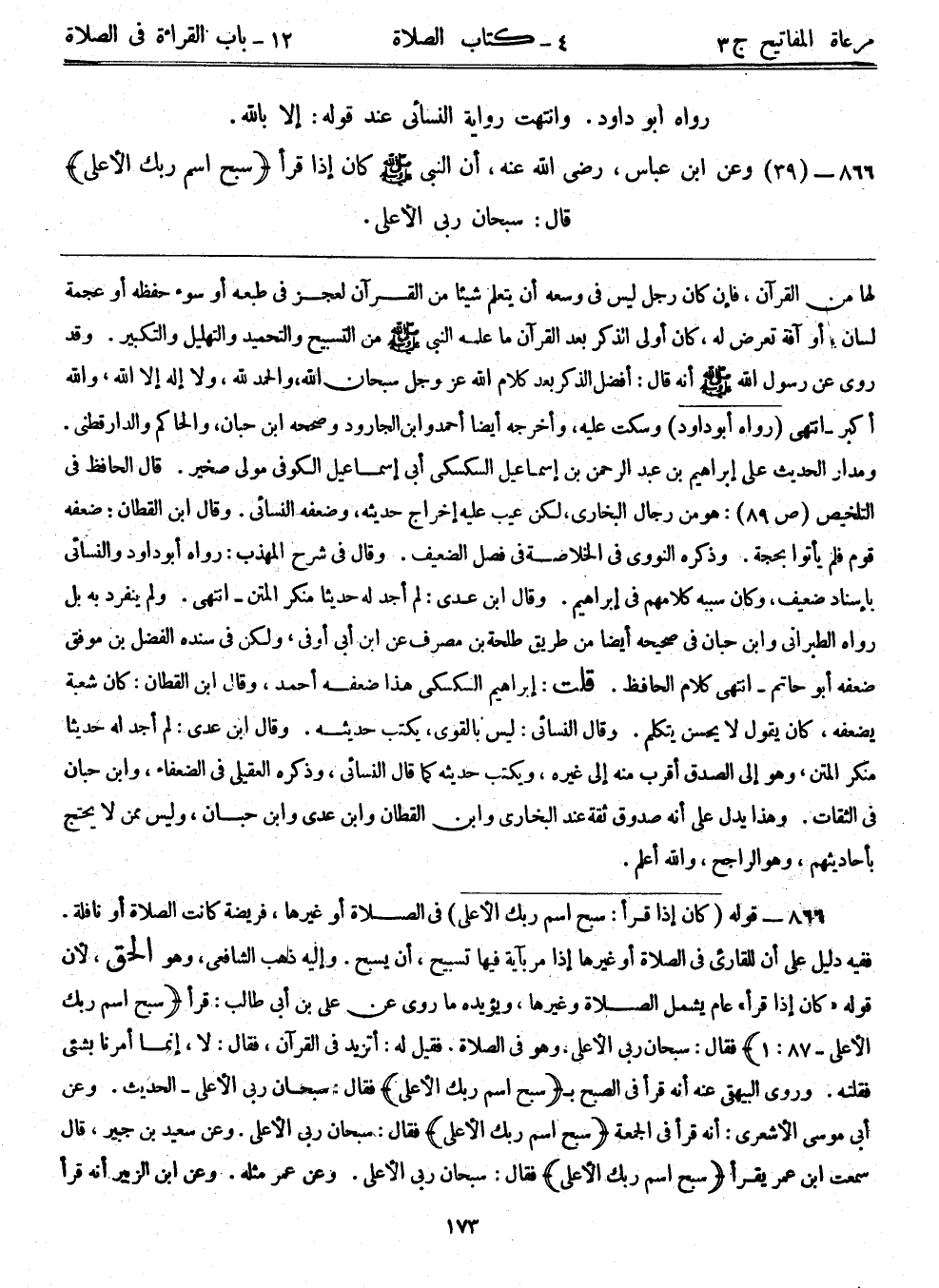 866- (39) وعن ابن عباس - رضي الله عنه - ((أن النبي - صلى الله عليه وسلم - كان إذا قرأ {سبح اسم ربك الأعلى} قال: سبحان ربي الأعلى.