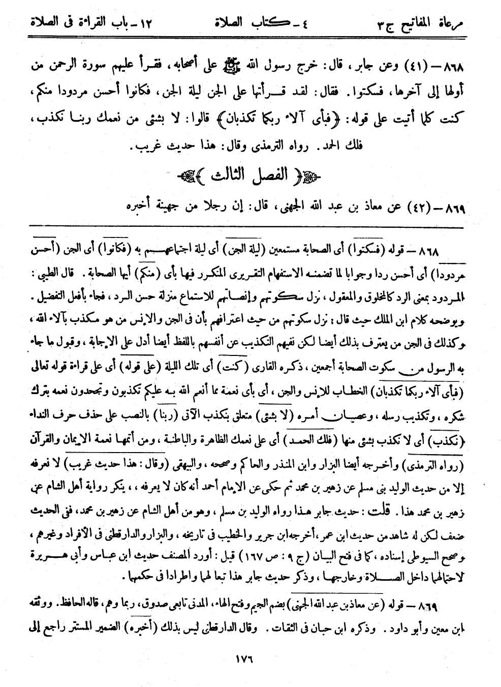 868- قوله: (فسكتوا) أي الصحابة مستمعين. (ليلة الجن) أي ليلة اجتماعهم به. (فكانوا) أي الجن. (أحسن مردوداً) أي أحسن رداً وجواباً لما تضمنه الاستفهام التقريري المتكرر فيها بأي. (منكم) أيها الصحابة. قال الطيبي: المردود بمعنى الرد كالمخلوق والمعقول، نزل سكوتهم وإنصاتهم للاستماع منزلة حسن الرد، فجاء بأفعل التفضيل. ويوضحه كلام ابن الملك حيث قال: نزل سكوتهم من حيث اعترافهم بأن في الجن والإنس من هو مكذب بآلاء الله، وكذلك في الجن من يعترف بذلك أيضاً، لكن نفيهم التكذيب عن أنفسهم باللفظ أيضاً أدل على الإجابة، وقبول ما جاء به الرسول من سكوت الصحابة أجمعين، ذكره القاري. (كنت) أي تلك الليلة. (على قوله) أي على قراءة قوله تعالى: (فبأي آلاء ربكما تكذبان) الخطاب للإنس والجن، أي بأي نعمة مما أنعم الله به عليكم تكذبون وتجحدون نعمه بترك شكره، وتكذيب رسله، وعصيان أمره. (لا بشيء) متعلق بنكذب الآتي. (ربنا) بالنصب على حذف حرف النداء. (نكذب) أي لا نكذب بشيء منها. (فلك الحمد) أي على نعمك الظاهرة والباطنة، ومن أتمها نعمة الإيمان والقرآن. (رواه الترمذي) وأخرجه أيضاً البزار وابن المنذر والحاكم وصححه، والبيهقي. (وقال: هذا حديث غريب) لا نعرفه إلا من حديث الوليد بني مسلم عن زهير بن محمد ثم حكى عن الإمام أحمد أنه كان لا يعرفه، وينكر رواية أهل الشام عن زهير بن محمد هذا. قلت: حديث جابر هذا رواه الوليد بن مسلم، وهو من أهل الشام عن زهير بن محمد، ففي الحديث ضعف لكن له شاهد من حديث ابن عمر، أخرجه ابن جرير والخطيب في تاريخه، والبزار والدارقطني في الأفراد وغيرهم، وصحح السيوطي إسناده، كما في فتح البيان (ج9: ص167) قيل: أورد المصنف حديث ابن عباس وأبي هريرة لاحتمالها داخل الصلاة وخارجها، وذكر حديث جابر هذا تبعاً لهما واطراداً في حكمهما.