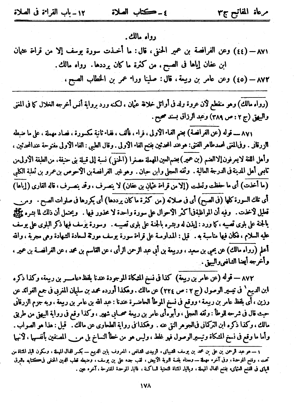 871- قوله: (عن الفرافصة) بضم الفاء الأولى، فراء، فألف، ففاء ثانية مكسورة، فصاد مهملة، على ما ضبطه الزرقاني. وفي المغني لمحمد طاهر الفتني: هو عند المحدثين بفتح الفاء الأولى. وقال الطيبي: الفاء الأولى مفتوحة عند المحدثين، وأهل اللغة لا يعرفون إلا الضم. (بن عمير) بضم العين المهملة مصغراً. (الحنفي) نسبة إلى قبيلة بن حنيفة، من الطبقة الأولى من تابعي أهل المدينة في الدرجة العالية. وثقه العجلي وابن حبان. وهو غير الفرافصة بن الأحوص بن عمرو بن ثعلبة الكلبي. (ما أخذت) أي ما حفظت وتعلمت. (إلا من قراءة عثمان بن عفان) لا ينصرف، وقد ينصرف، قاله القاري. (إياها) أي تلك السورة كلها. (في الصبح) أي في صلاته. (من كثرة ما كان يرددها) أي يكررها في صلوات الصبح. ومن تعليل لأخذت. وفيه أن المواظبة في أكثر الأحوال على سورة واحدة لا محذور فيها. ويحتمل أن ذلك لما بشره - صلى الله عليه وسلم - بالجنة على بلوى تصيبه، كما ورد: إيذن له وبشره بالجنة على بلوى تصيبه. وسورة يوسف فيها ذكر البلوى على يوسف - عليه السلام -، فكان فيها مناسبة به. قيل: المداومة على قراءة سورة يوسف مورثة لسعادة الشهادة وهي مجربة، والله أعلم. (رواه مالك) عن يحيى بن سعيد، وربيعة بن أبي عبد الرحمن الرأي، عن القاسم بن محمد، عن الفرافصة بن عمير، وأخرجه أيضاً الشافعي والبيهقي.