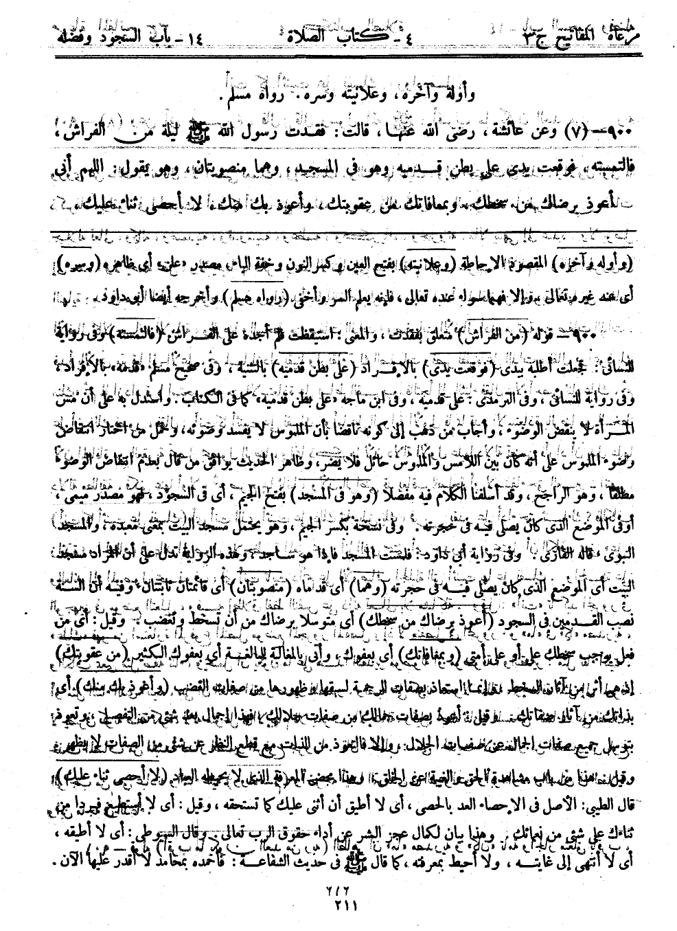 900- (7) وعن عائشة، رضي الله عنها، قالت: ((فقدت رسول الله - صلى الله عليه وسلم - ليلة من الفراش، فالتمسته، فوقعت يدي على بطن قدميه وهو في المسجد، وهما منصوبتان، وهو يقول: اللهم أني أعوذ برضاك من سخطك، وبمعافاتك من عقوبتك، وأعوذ بك منك، لا أحصي ثناء عليك،